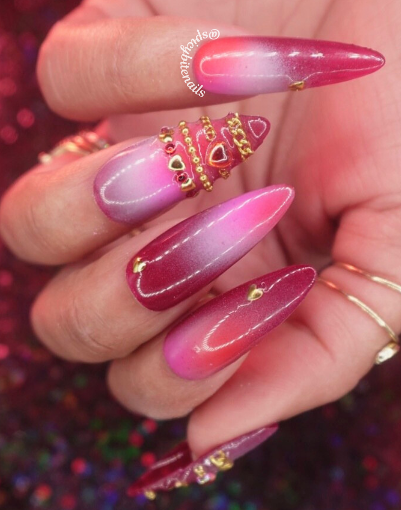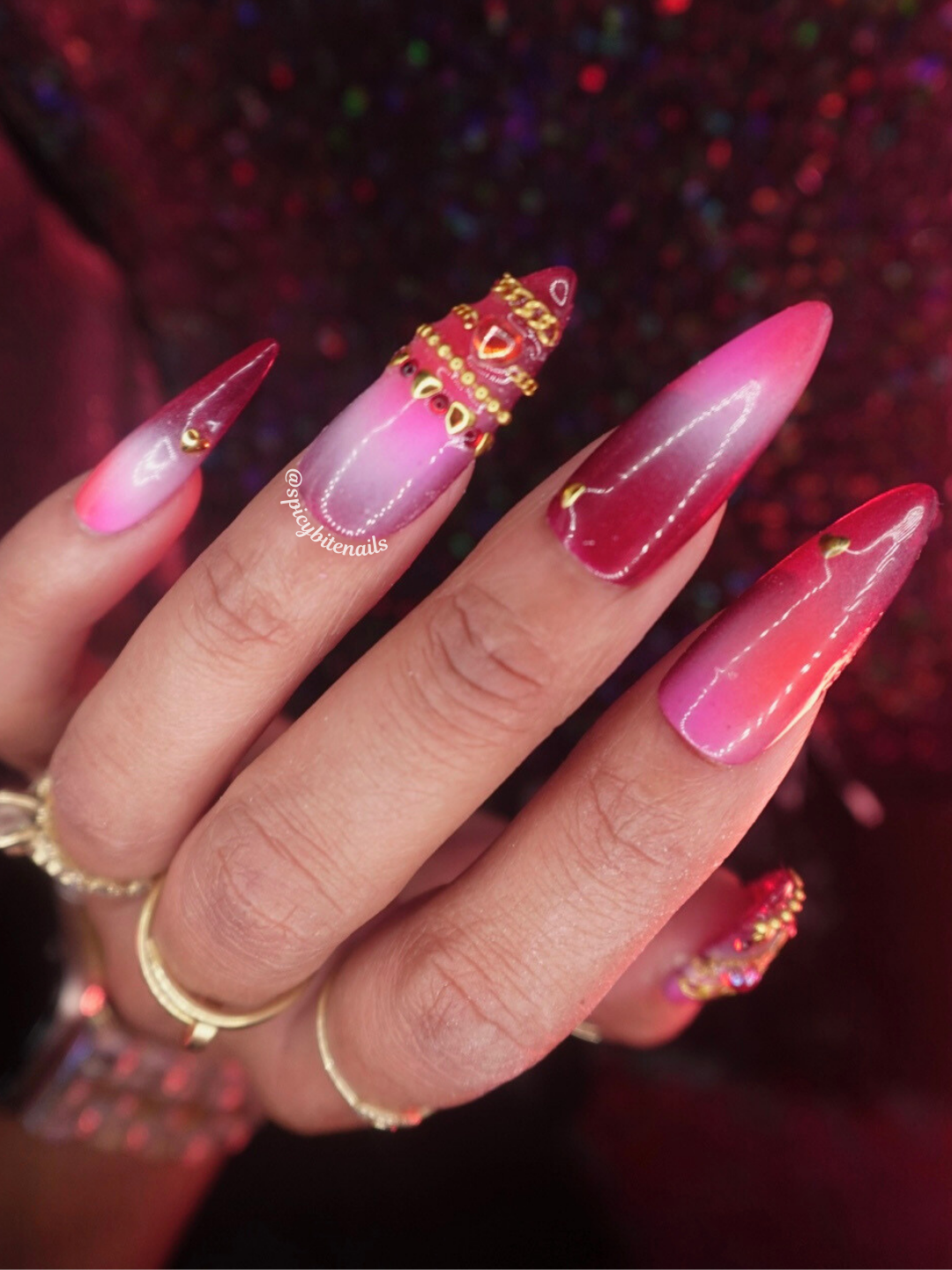Hearts & Heirlooms is a romantic Valentine’s Day press-on nail set inspired by vintage jewelry, passed-down love, and modern glam. This airbrushed design blends soft blush, rose, and deep wine tones into a seamless gradient, finished with sculptural gold bangles that feel like treasured heirlooms reimagined.
