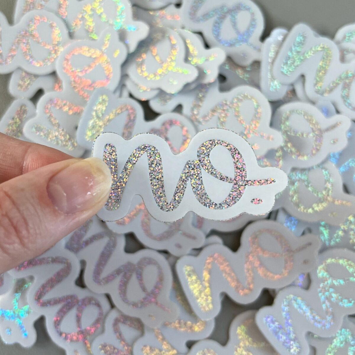 The word “no.” hand-lettered by Rachel of Lemon Press Studio in holographic glitter, on a white background