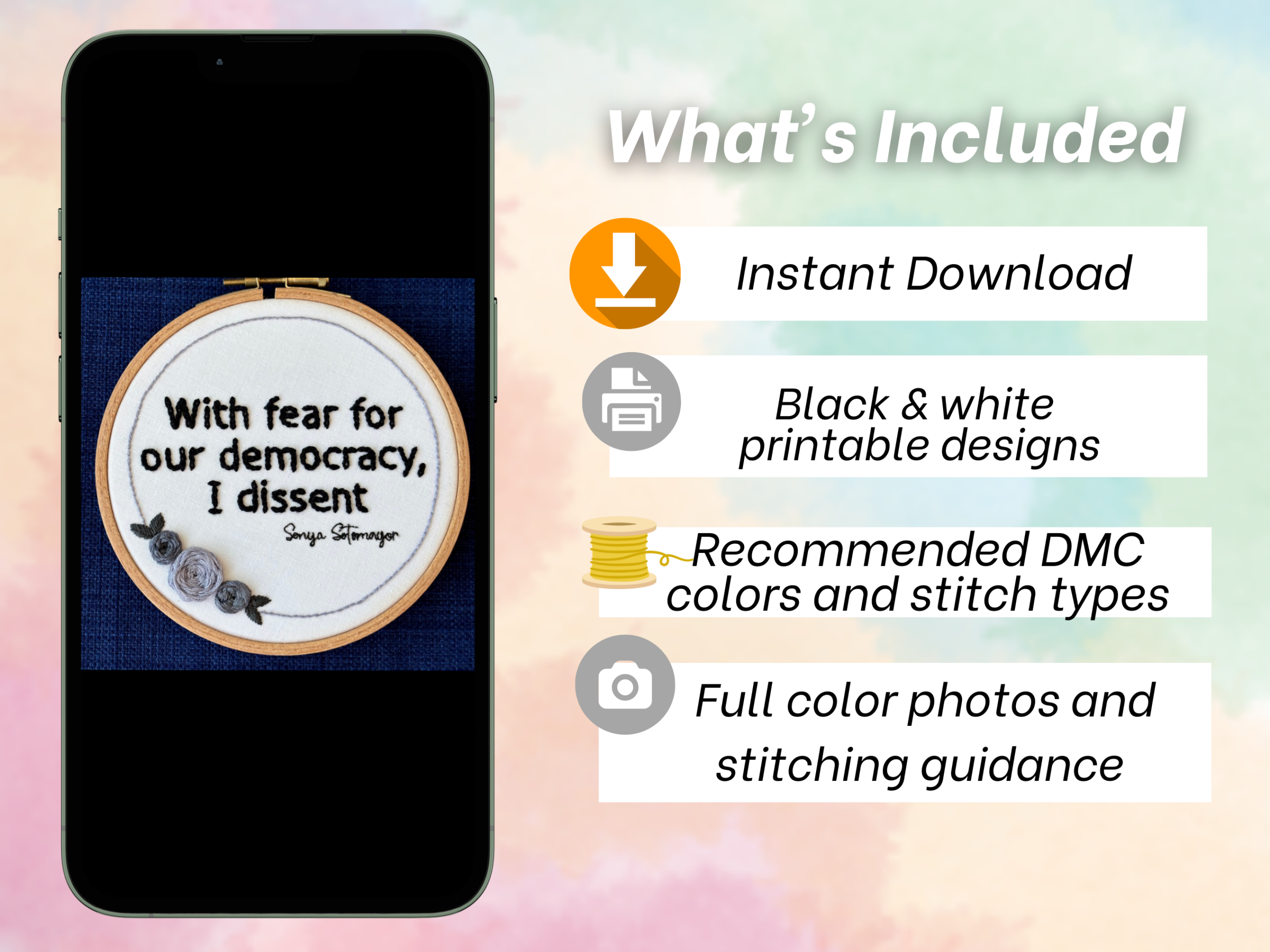 “With fear for democracy, I dissent” This quote from Supreme Court Justice Sonia Sotomayor* resonates with a lot of people I know. It is perfect for similarly frustrated / angry / appalled / progressive / democratic / feminist / lawyer people in your life! Also helpful if you want to be stabby. Display it in your house so people know where you stand, or give one to someone you love. **Please note: I realized long after stitching this hoop that I had made a huge mistake and spelled Justice Sotomayor’s name incorrectly. I am so embarrassed. Please know that the PDF pattern you receive upon purchase contains the correct spelling**