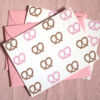 This set includes blank folded greeting cards featuring our pattern of illustrated pretzels, some of which are pink of course! They are totally adorable and have none of the calories of real junk food.