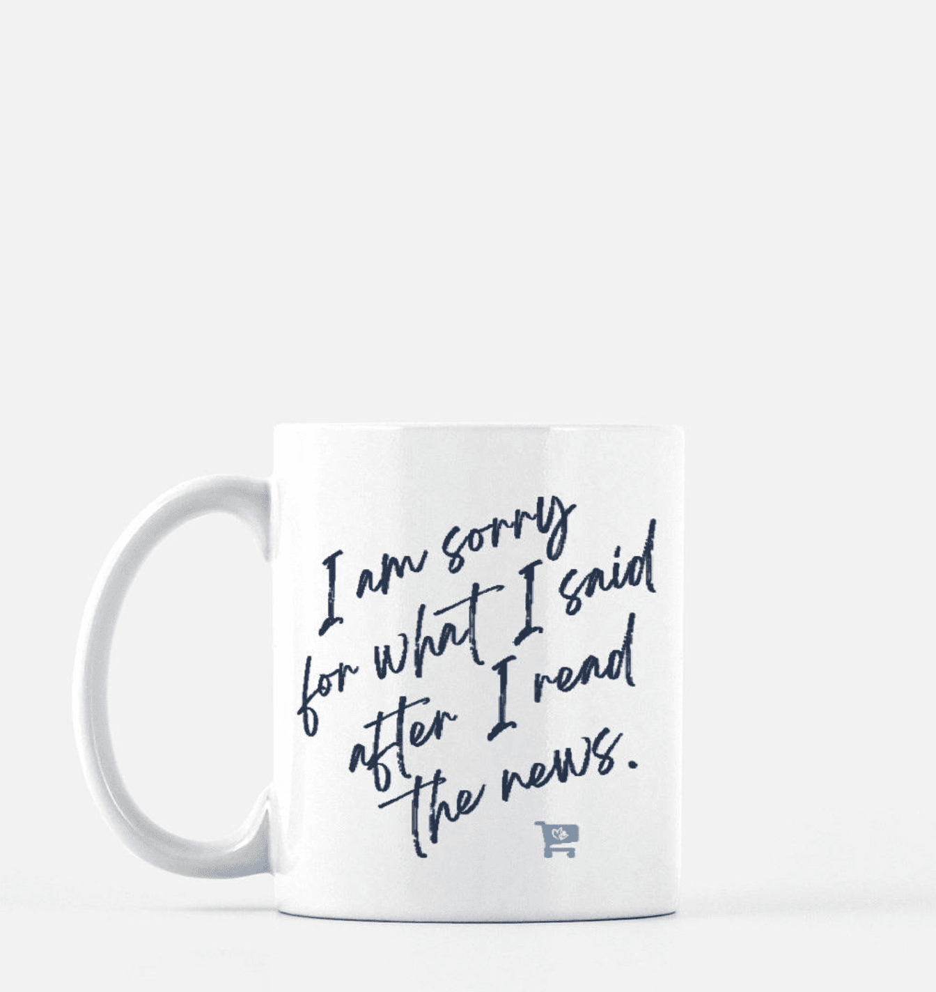 This classic white ceramic mug features “I’m Sorry for What I Said After I Read the News” in handwritten lettering—because let’s be honest, staying informed can be emotionally taxing. Whether you’re sipping coffee, tea, or something stronger (we don’t judge), this mug is here to help you process the latest chaos with a little humor.