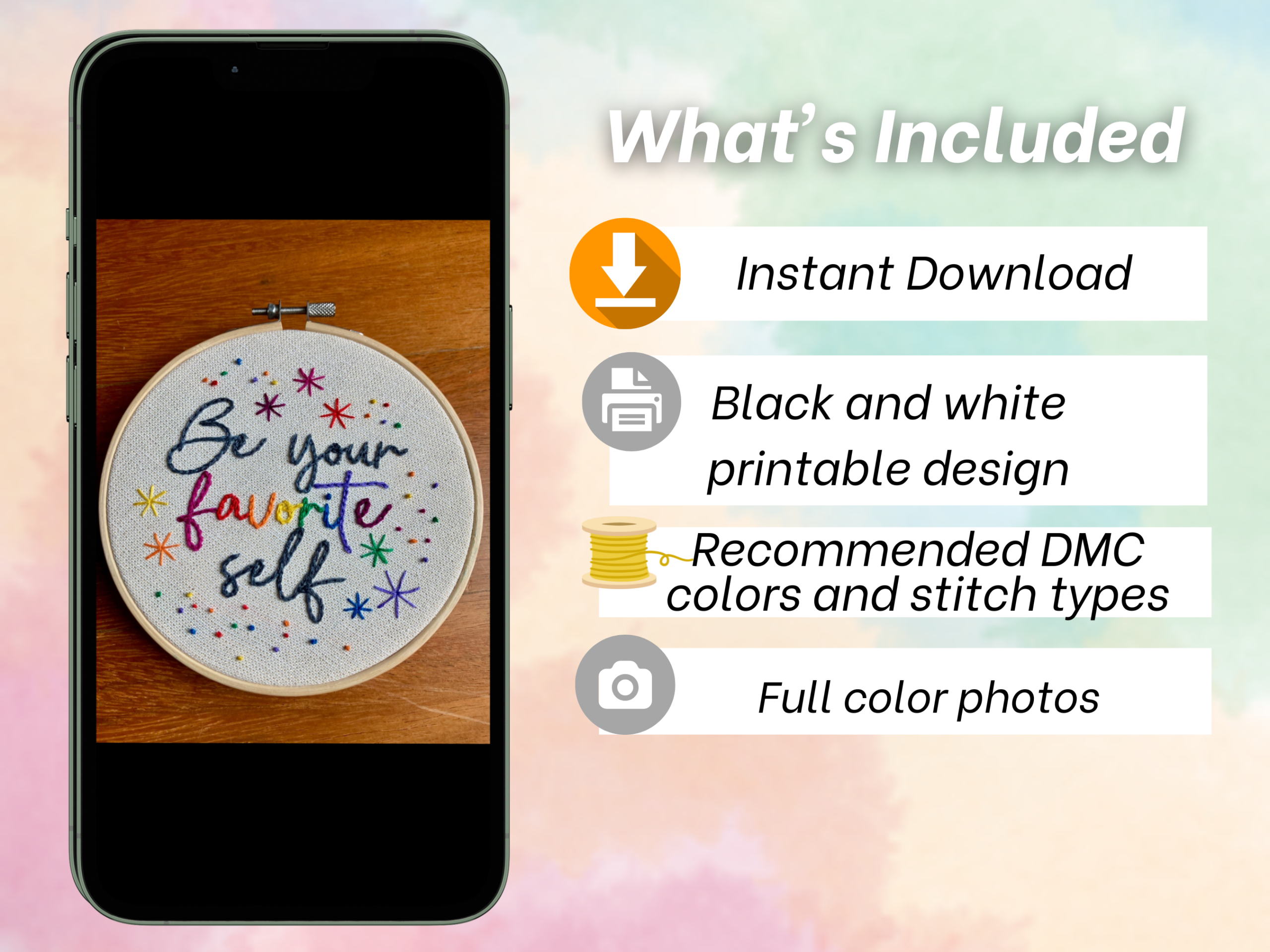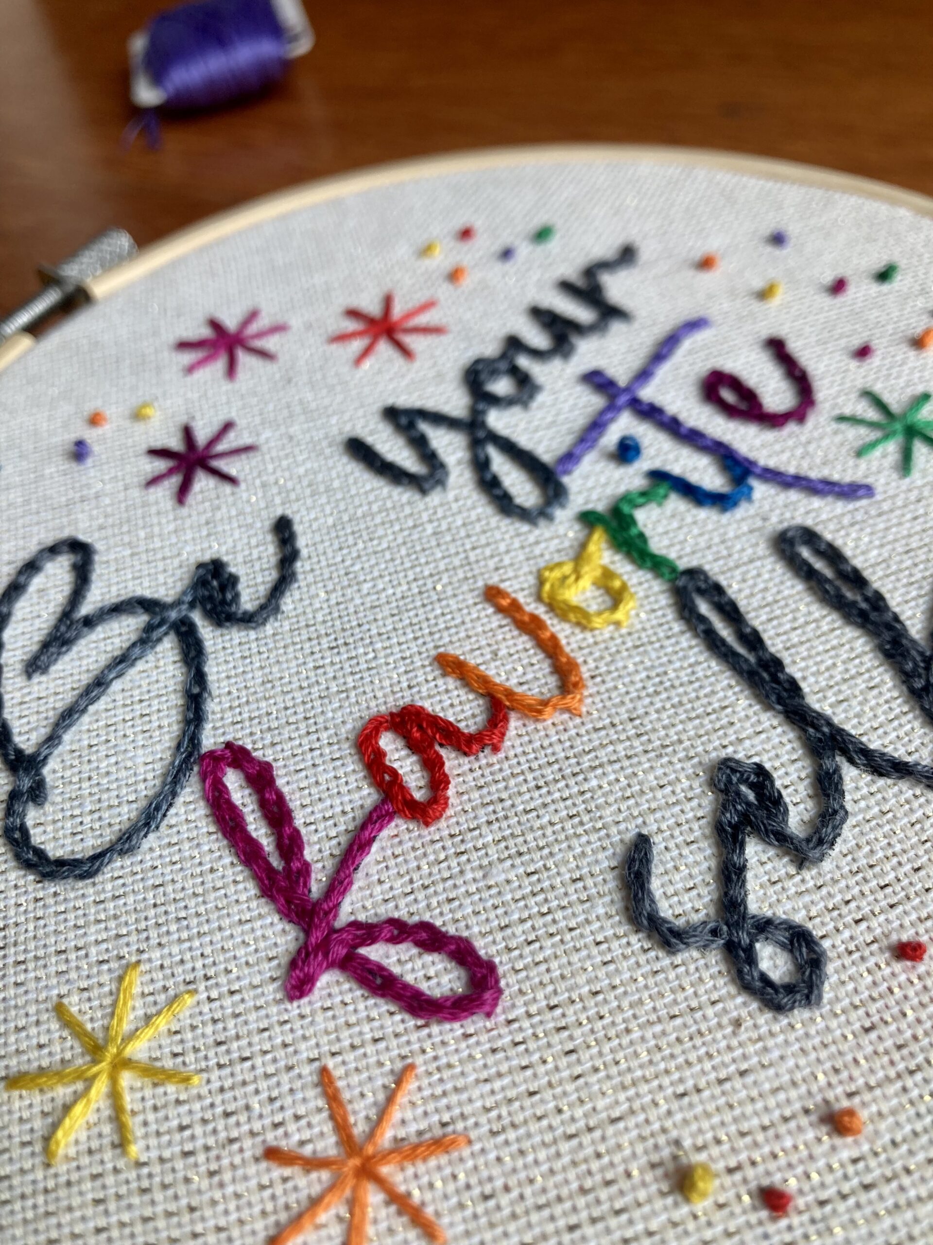 Inspirational Quote Beginner Hand Embroidery Pattern: Be Your Favorite Self. Rainbow Pride, Stars (PDF Download)