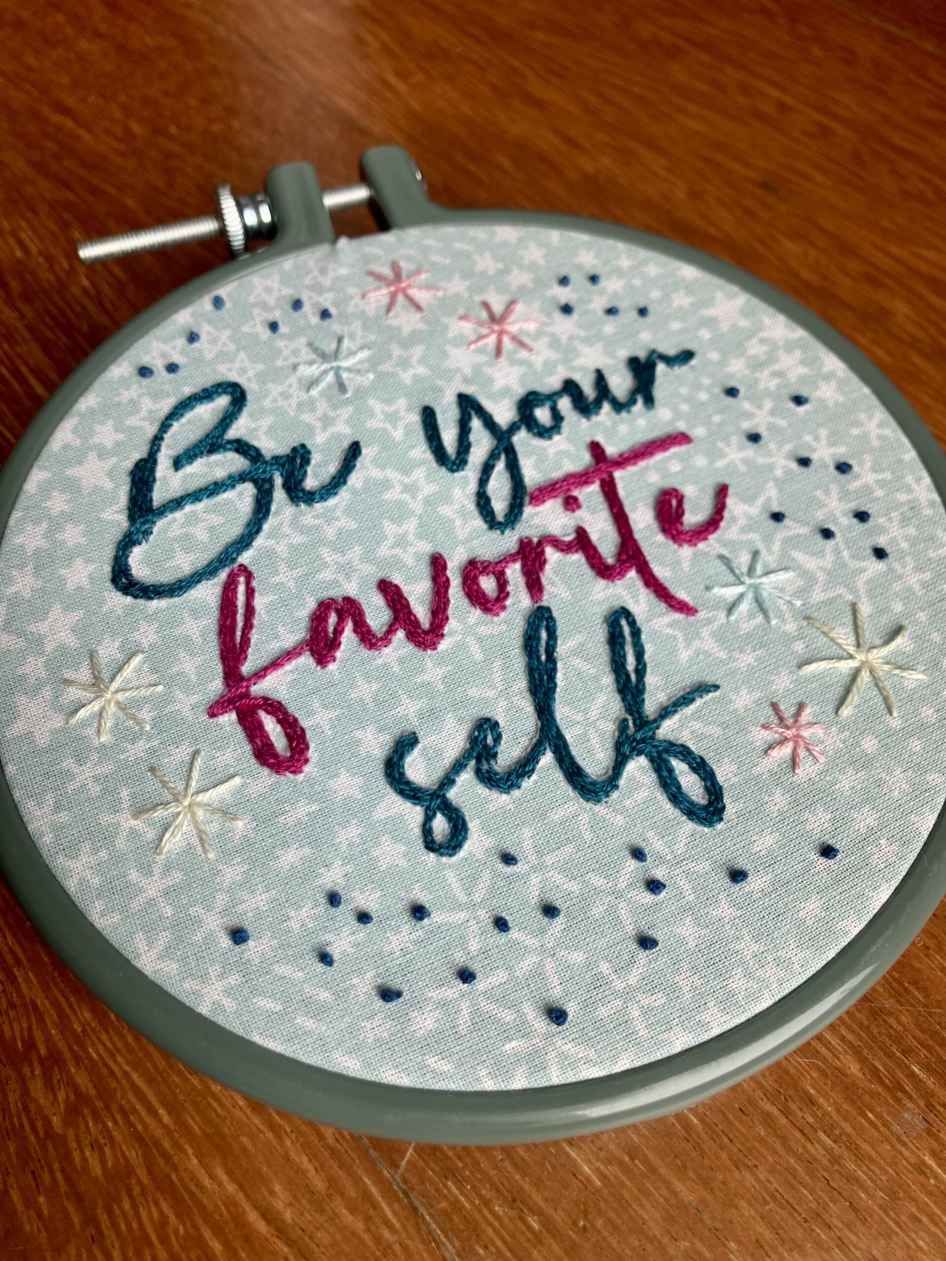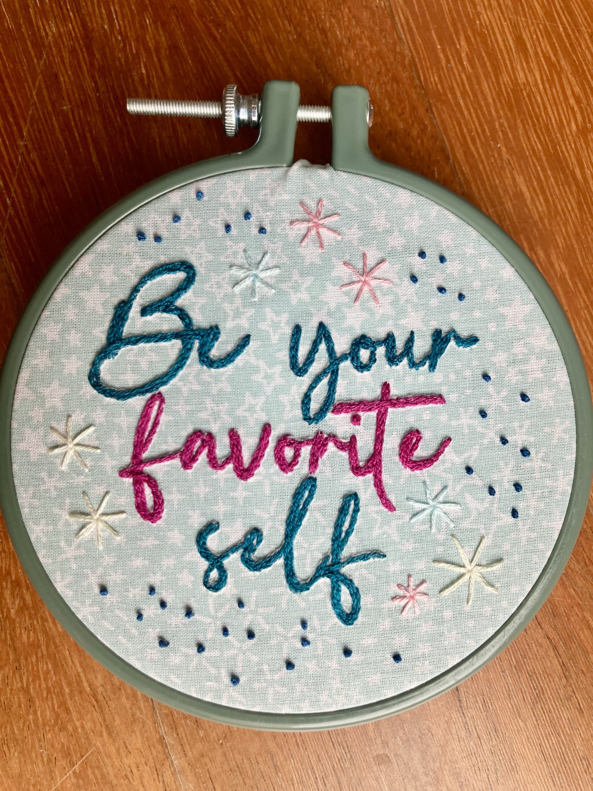 This “Be Your Favorite Self” quote I first heard from Peloton’s Selena Samuela is one I love. “Favorite” is different for everyone, and I hope it encourages you to be your most generous, quirky, graceful, confident, sassy, thoughtful, cheeky, true, funny, kind, glamorous, inclusive, open hearted, dedicated, proud or even organized self 🙂 This pattern is beginner friendly, quick, and fun to sew. I provide two color palettes with suggested DMC thread colors plus stitch suggestions, but I encourage you to be creative and choose your own! I used a cream colored fabric with some sparkly gold woven in for the rainbow design, and a light blue fabric with white stars for the second color palette. Perfect for anyone who needs some Peloton wall art, a pick-me-up, or inspiration!