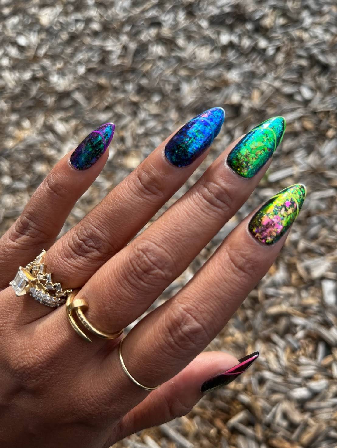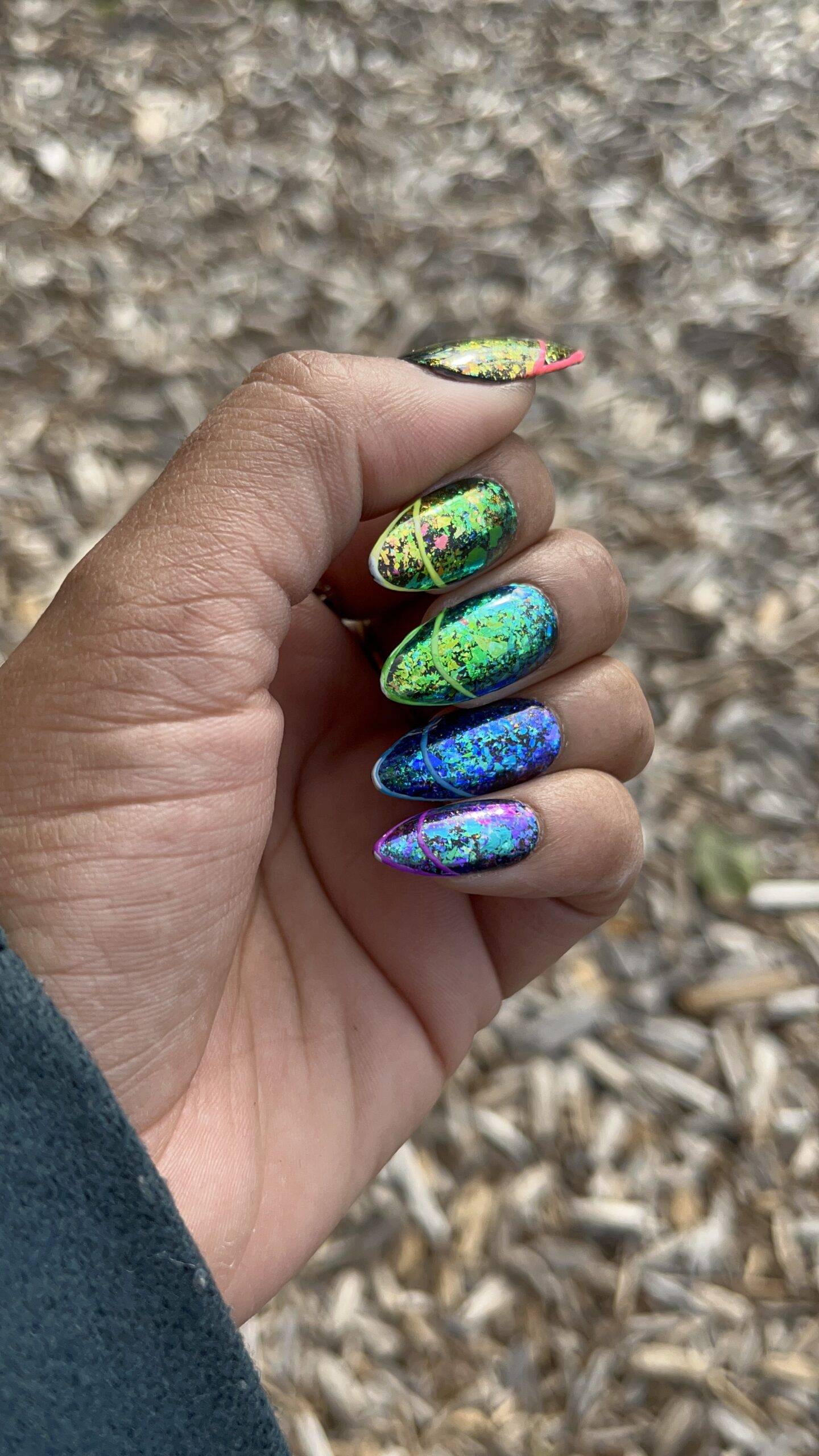 These nails are meant to be the life of the party! Rainbow light reflecting chameleon flakes with a delicate neon rainbow of French tips. People will definitely notice these!