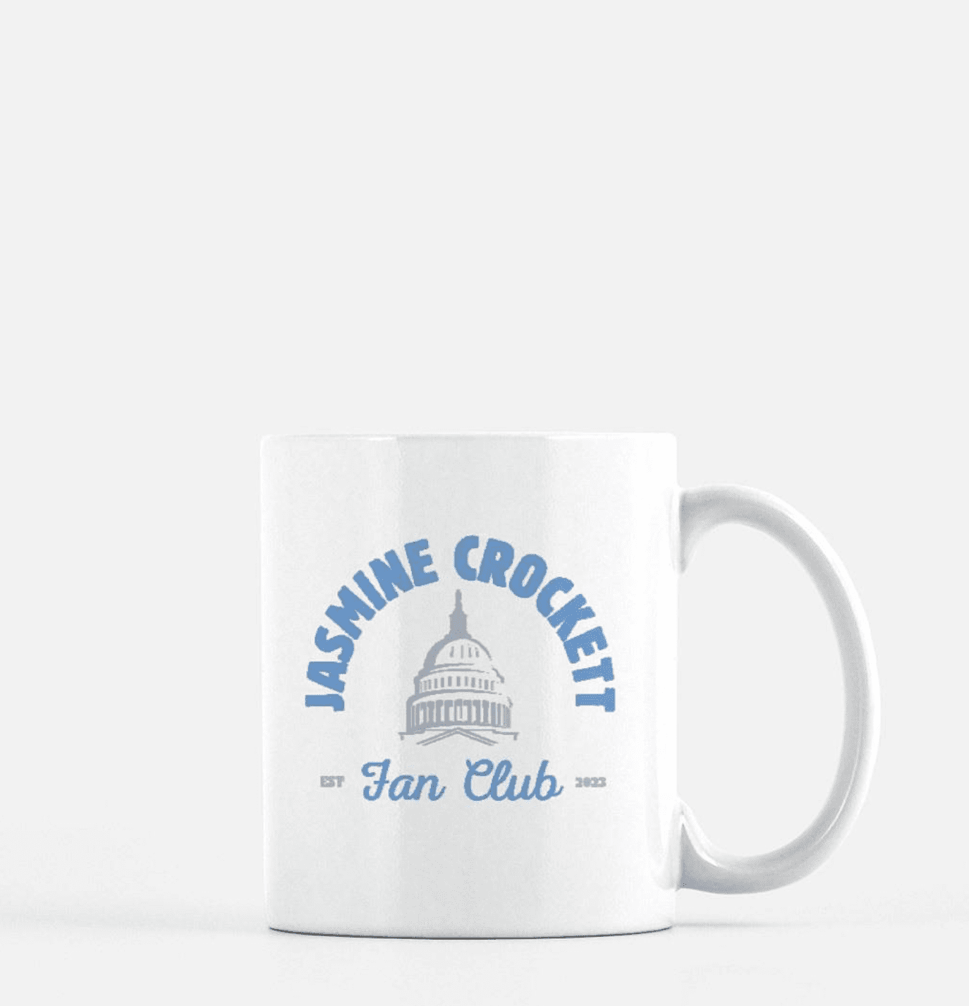 Sip in solidarity. The Jasmine Crockett Fan Club Mug is a bold tribute to a fearless progressive voice. Perfect for your morning coffee and daily dose of inspiration.