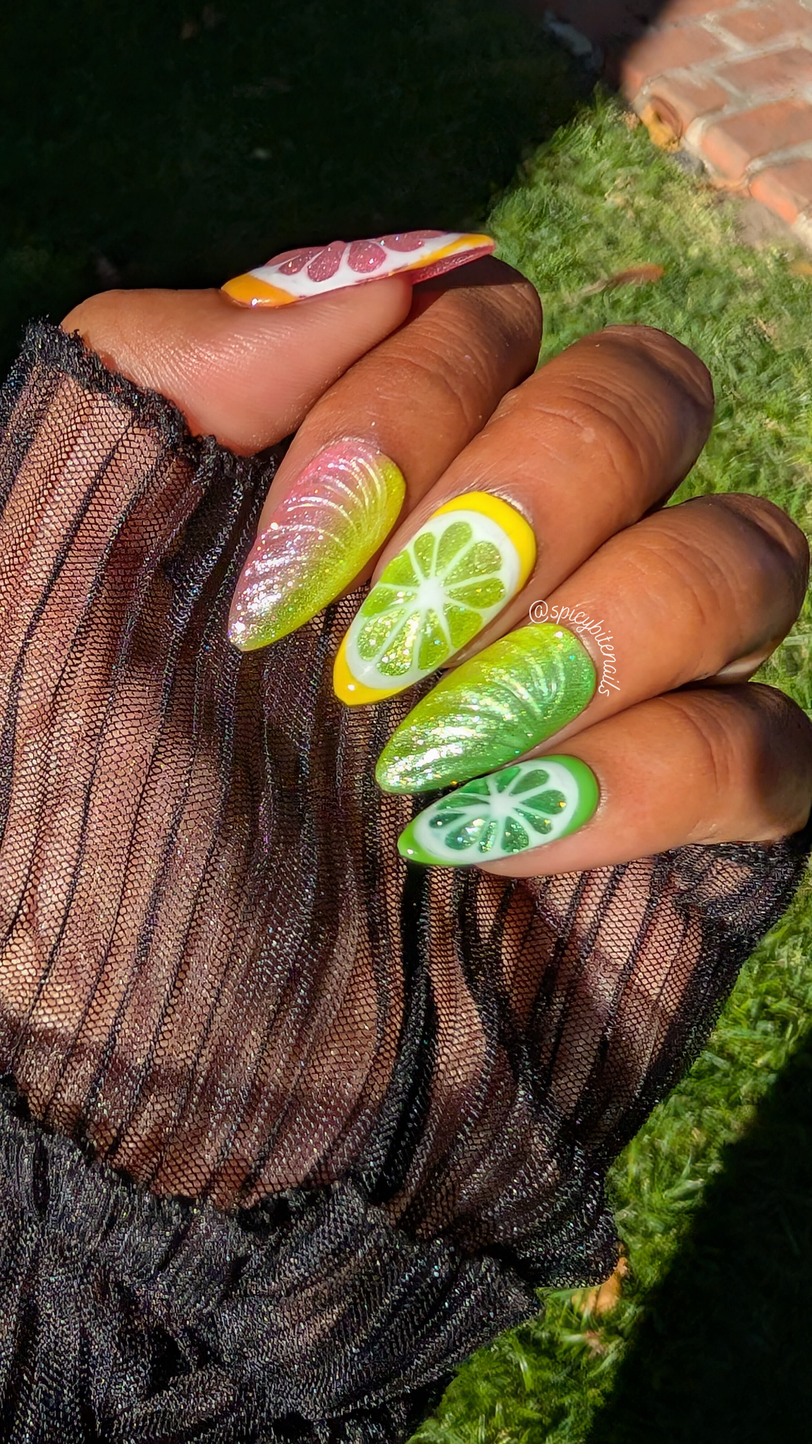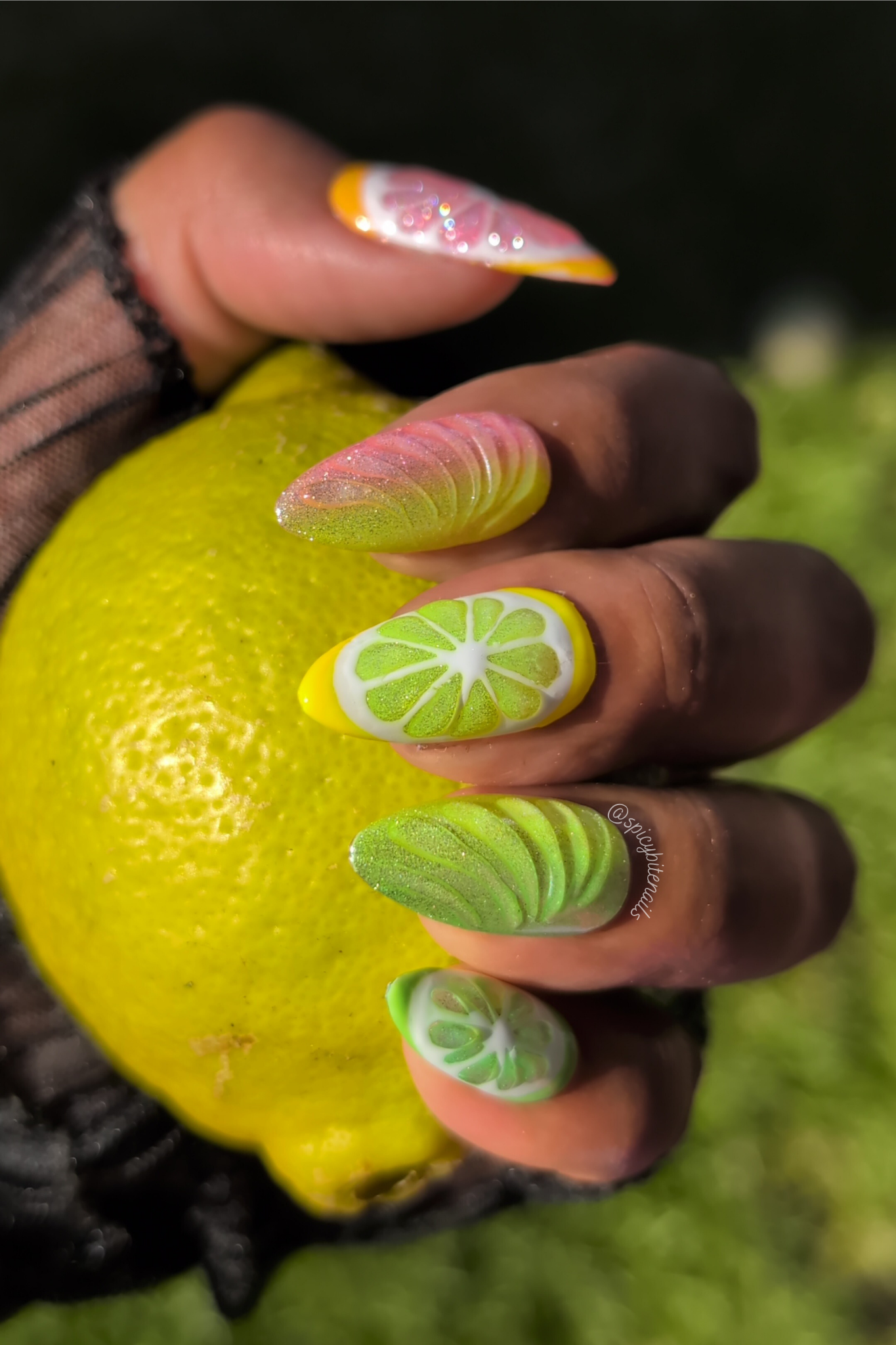 These might be the juiciest nails around and are the cutest set for summer! Sparkly lemon, lime and grapefruit nails with 3D accents flanked by ombre 3D swirls.