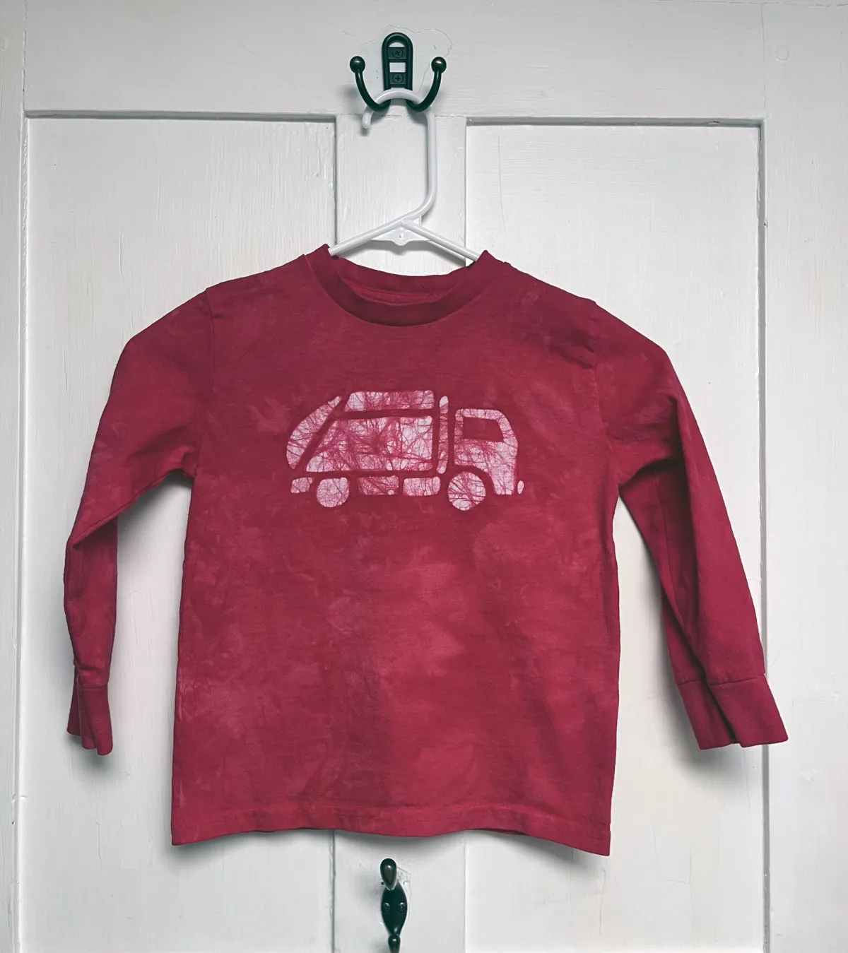 I bet you know a little one who loves garbage trucks — I do! For these custom order shirts, I stencil my original garbage truck design onto the chest of a Rabbit Skins brand long-sleeve shirt before dyeing the shirt the color of your choice.