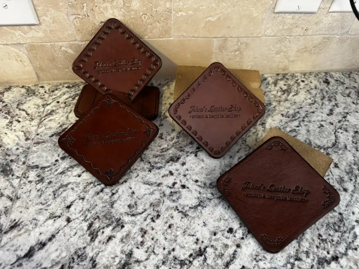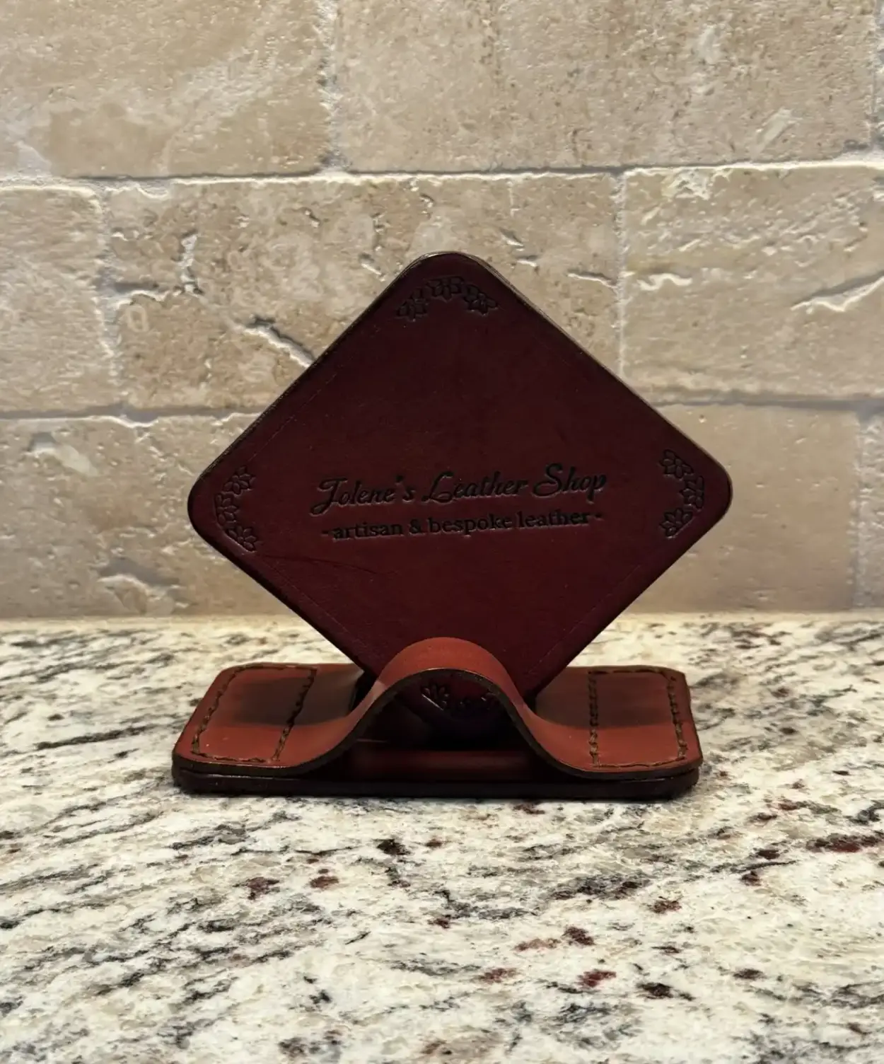 Made from Hermann Oak Chocolate skirting leather, these coasters are the perfect gift. The coaster stand can also be used as a desktop business card holder.