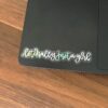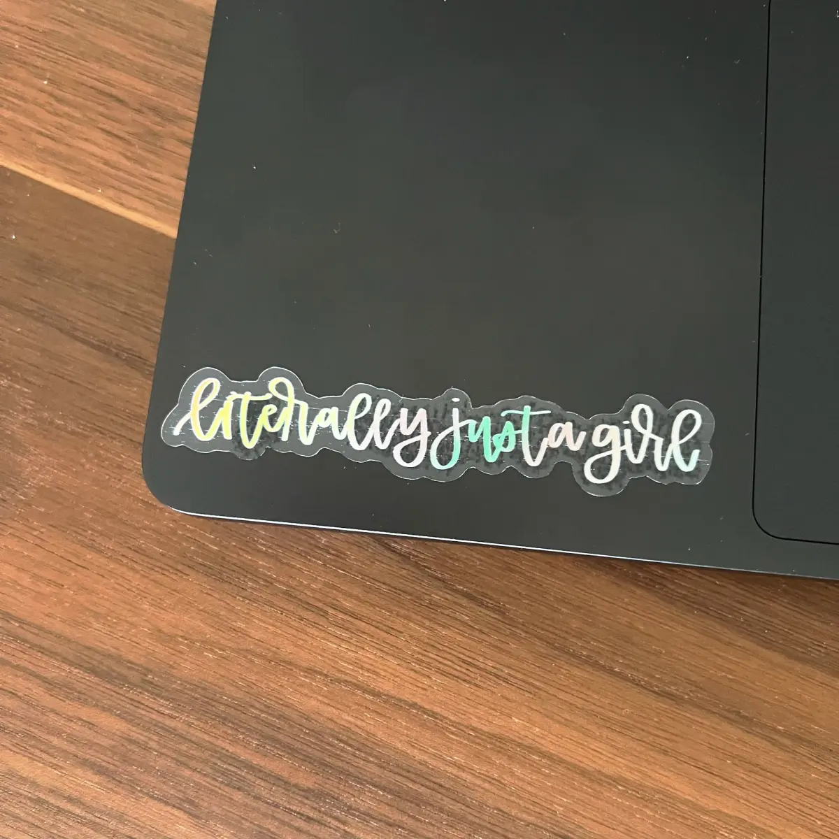 Sticker is hand-drawn by Rachel of Lemon Press Studio, featuring the phrase, “literally just a girl” in a modern calligraphy style, in an orange, yellow, pink, and mint green gradient colorway