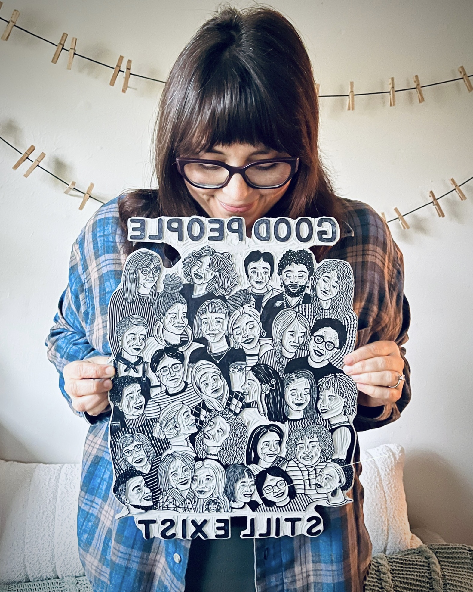 “Look for the Helpers” is a limited edition linoleum block print inspired by the good people in communities making sure their neighbors have access to food and other necessities. The title is taken from a famous quote by Mr. Roger’s: