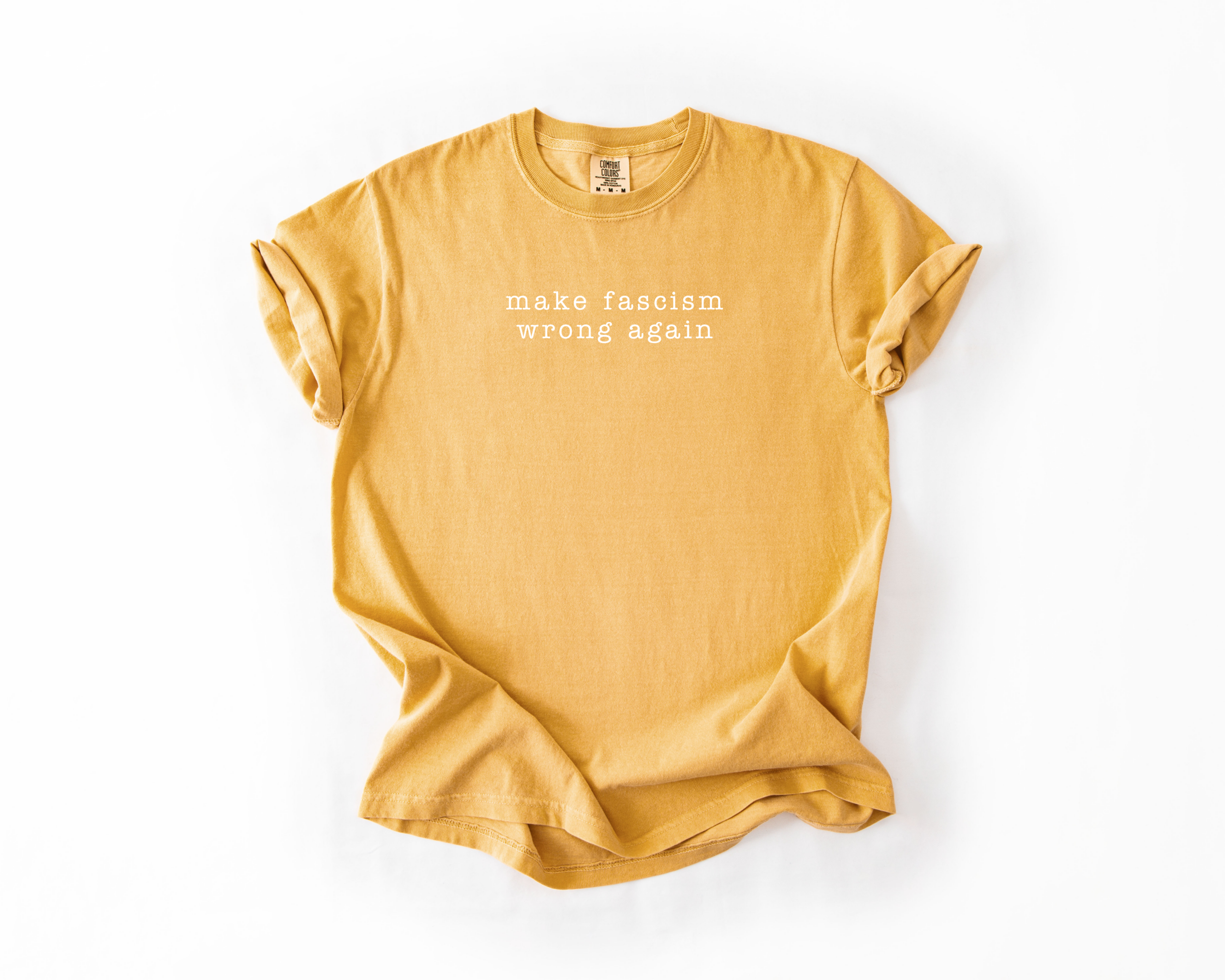 Our “Make Fascism Wrong Again” shirt delivers a powerful message in a simple, understated design that speaks volumes.