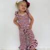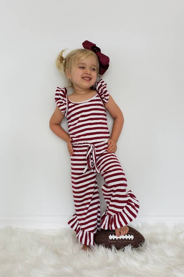 This adorable romper features ruffled cap sleeves and cuffs with a maroon and white striped design and tie front.