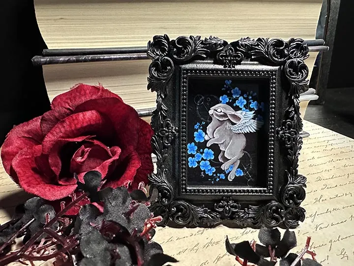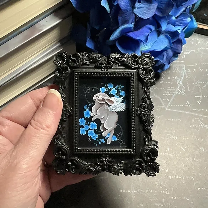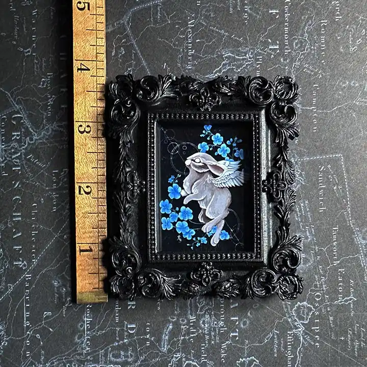 Tiny intricate black frame with original artwork. Artwork was originally painted on a 5×7 Wooden canvas. The painting itself features an Angel Bunny flying through Forget Me Nots. The frame itself has a Victorian style frame and a little stand in the back so that it can go on a desk, bedside table or shelf. The frame is approximately 3 & 3/4 an inch tall.