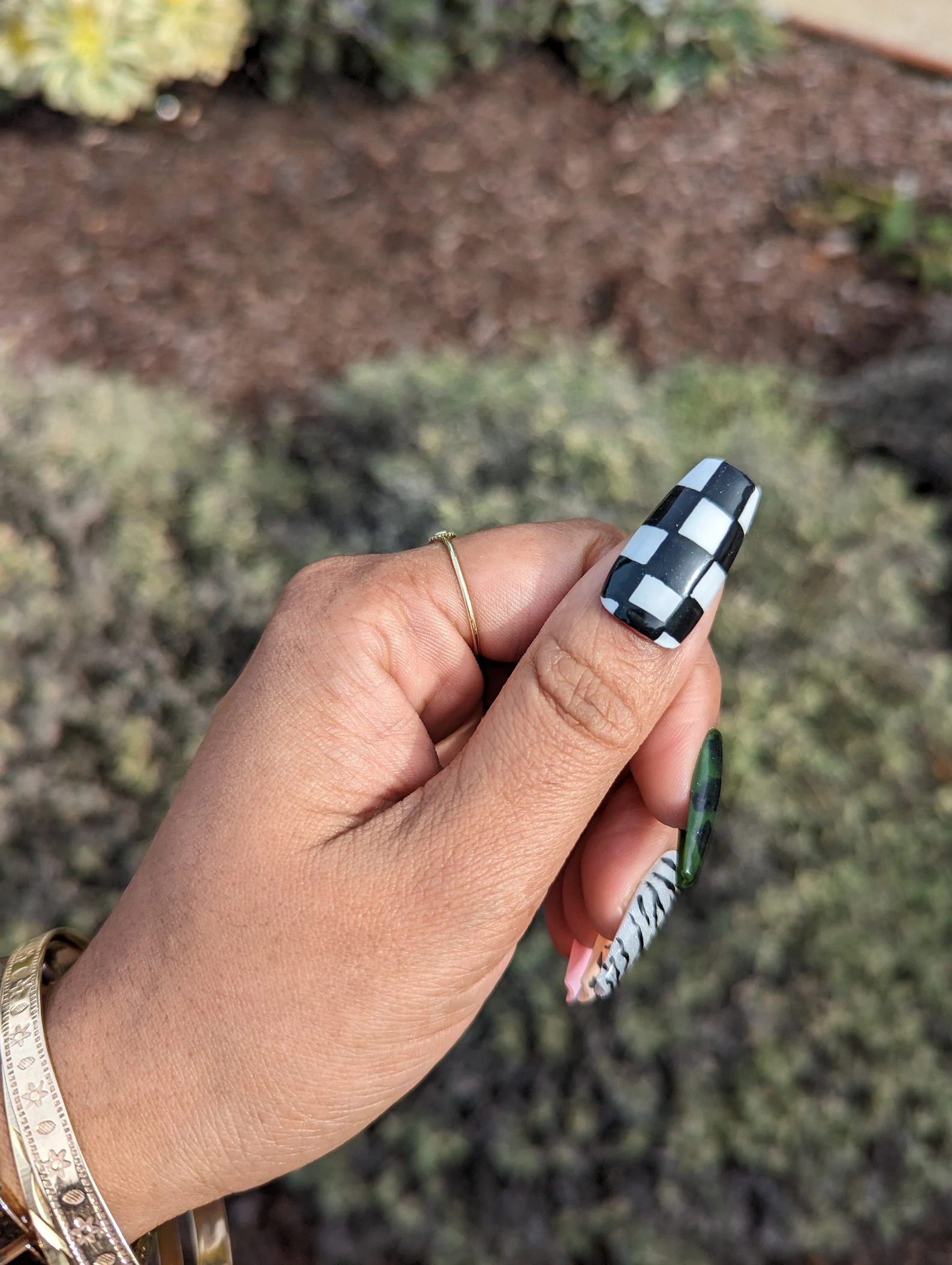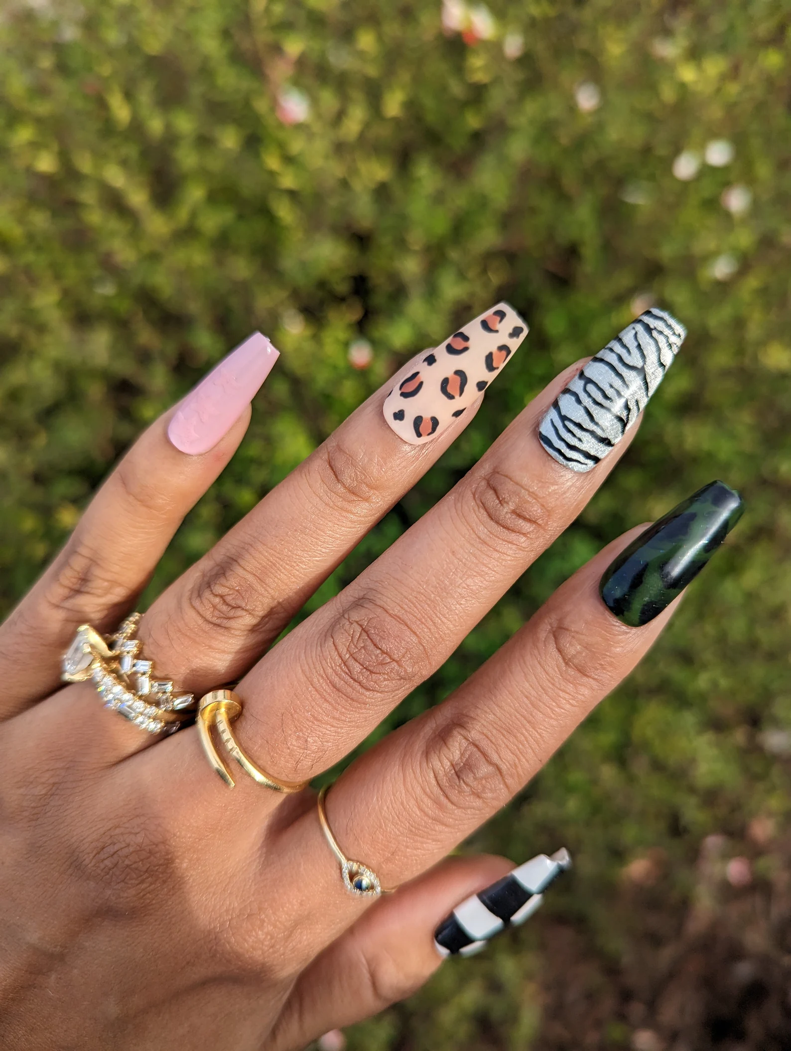 Can’t decide what vibe you’re rocking with your nails? What about all of them! A little leopard, a little zebra, a little camouflage and some checkboard — you’ll match everything! Inspired by the Nike Tunnel Walk Air Force 1s, you can at least match your shoes.