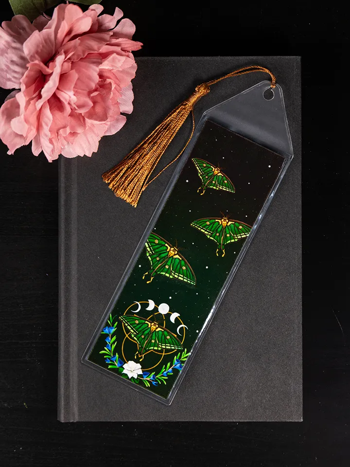 Bookmark with original Spanish Moon Moth painting. Bookmarks come sleeved for protection with a colored tassel. Tassel color may vary but will match the bookmark as best as possible.
