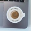 Sticker is hand-drawn by Rachel of Lemon Press Studio, featuring an illustration of a cup of espresso on a saucer from above, with the words, “more espresso, less depresso” hand-lettered in a modern calligraphy style around the saucer