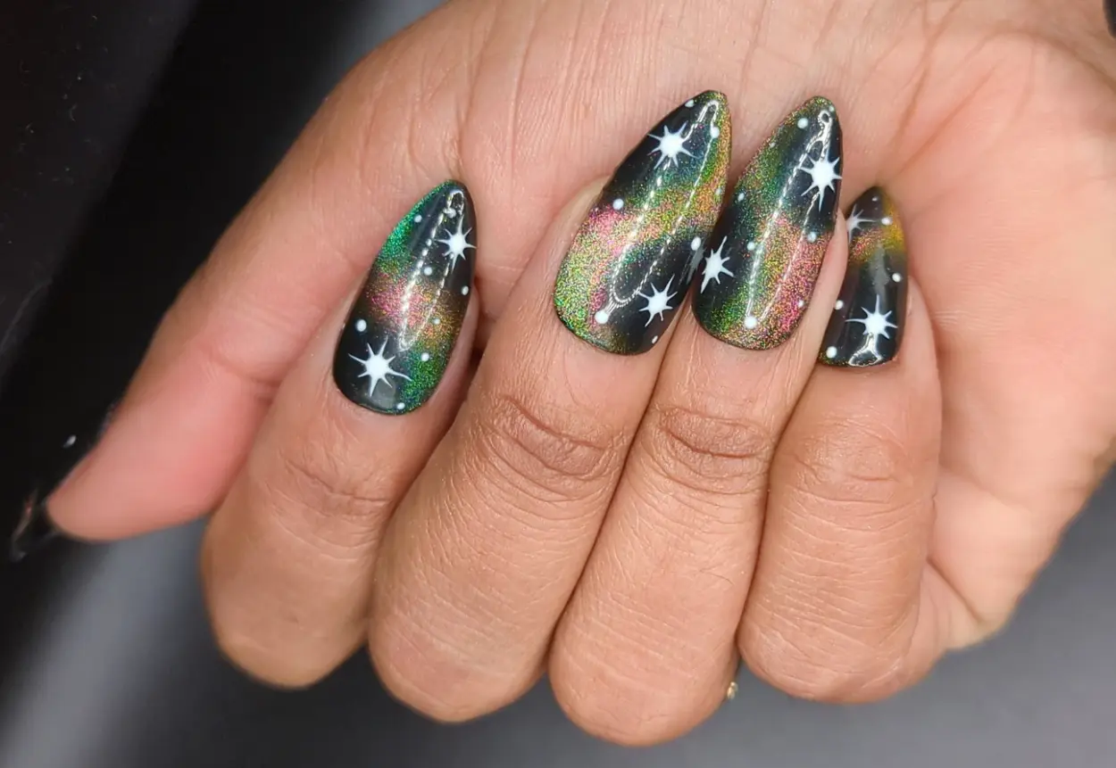 Moss and Moonlight is where earthy enchantment meets celestial glam. This hand-painted press-on nail set features a soft sage green base kissed with white florals, golden chrome sculptural accents, and opalescent shimmer that glows like moonlight in a mossy grove. Each nail is a miniature spell—perfect for forest queens, nature lovers, and anyone who dreams in green and gold.