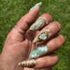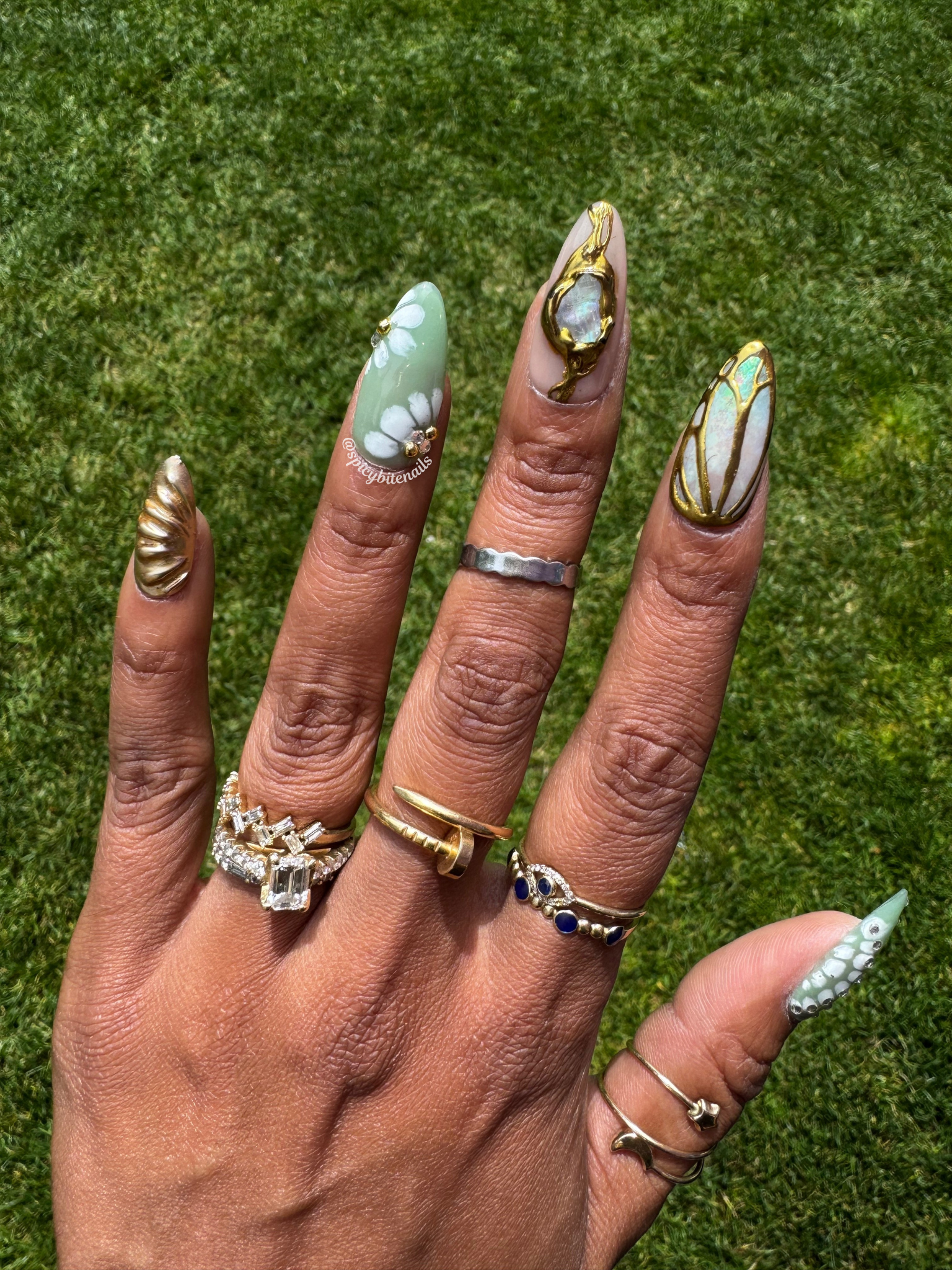 Moss and Moonlight is where earthy enchantment meets celestial glam. This hand-painted press-on nail set features a soft sage green base kissed with white florals, golden chrome sculptural accents, and opalescent shimmer that glows like moonlight in a mossy grove. Each nail is a miniature spell—perfect for forest queens, nature lovers, and anyone who dreams in green and gold.