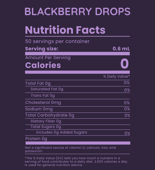 Ingredients: Natural Blackberry Flavor, Water, non-GMO Citric Acid, Monk Fruit Extract, Malic Acid
