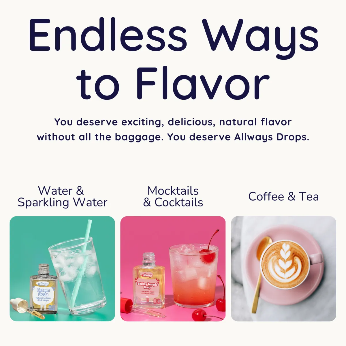 Allways made with all-natural ingredients and sweetened with monk fruit, these zero-calorie, zero-sugar natural water enhancer drops turn your drink into a sweet escape that’ll make your taste buds do a happy dance without the sugar crash. Packaged in a sustainable 30 mL glass bottle with an easy-to-use dropper, each bottle makes up to 50 delicious 8 oz drinks, reducing waste from single-use plastic bottles. Stay hydrated on-the-go and enjoy guilt-free flavor, all while making a more eco-conscious choice. No artificial sweeteners. No preservatives. No added colors or dyes. Just pure, natural taste. Drink up, flavor on, and Allways keep it natural!