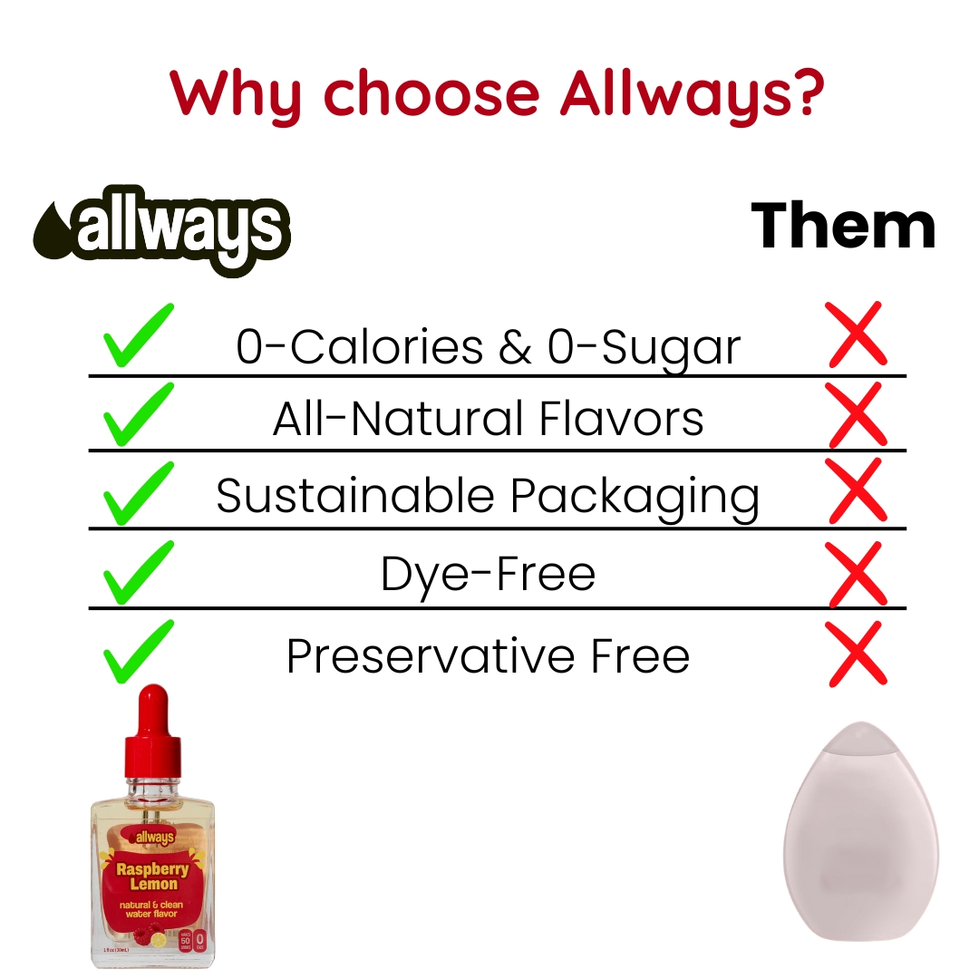 Allways made with all-natural ingredients and sweetened with monk fruit, these zero-calorie, zero-sugar natural water enhancer drops turn your drink into a sweet escape that’ll make your taste buds do a happy dance without the sugar crash. Packaged in a sustainable 30 mL glass bottle with an easy-to-use dropper, each bottle makes up to 50 delicious 8 oz drinks, reducing waste from single-use plastic bottles. Stay hydrated on-the-go and enjoy guilt-free flavor, all while making a more eco-conscious choice. No artificial sweeteners. No preservatives. No added colors or dyes. Just pure, natural taste. Drink up, flavor on, and Allways keep it natural!