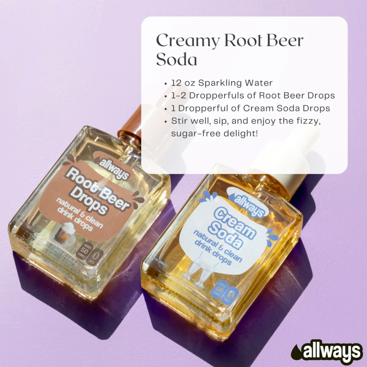 Allways made with all-natural ingredients and sweetened with monk fruit, these zero-calorie, zero-sugar natural water enhancer drops are bound to make you feel like you’re sipping your favorite classic root beer without the sugar crash. Packaged in a sustainable 30 mL glass bottle with an easy-to-use dropper, each bottle makes up to 50 delicious 8 oz drinks, reducing waste from single-use plastic bottles. Stay hydrated on-the-go and enjoy guilt-free flavor, all while making a more eco-conscious choice. No artificial sweeteners. No preservatives. No added colors or dyes. Just pure, natural taste. Drink up, flavor on, and Allways keep it natural!