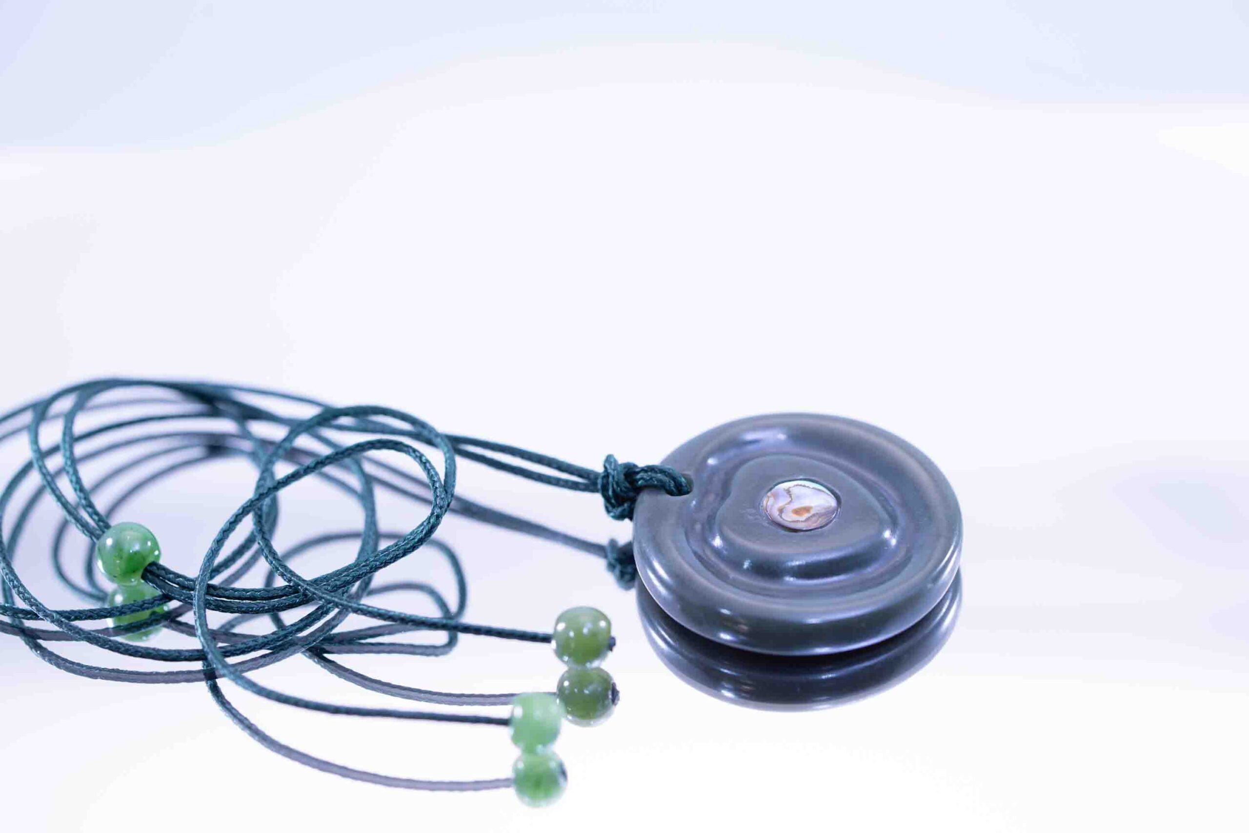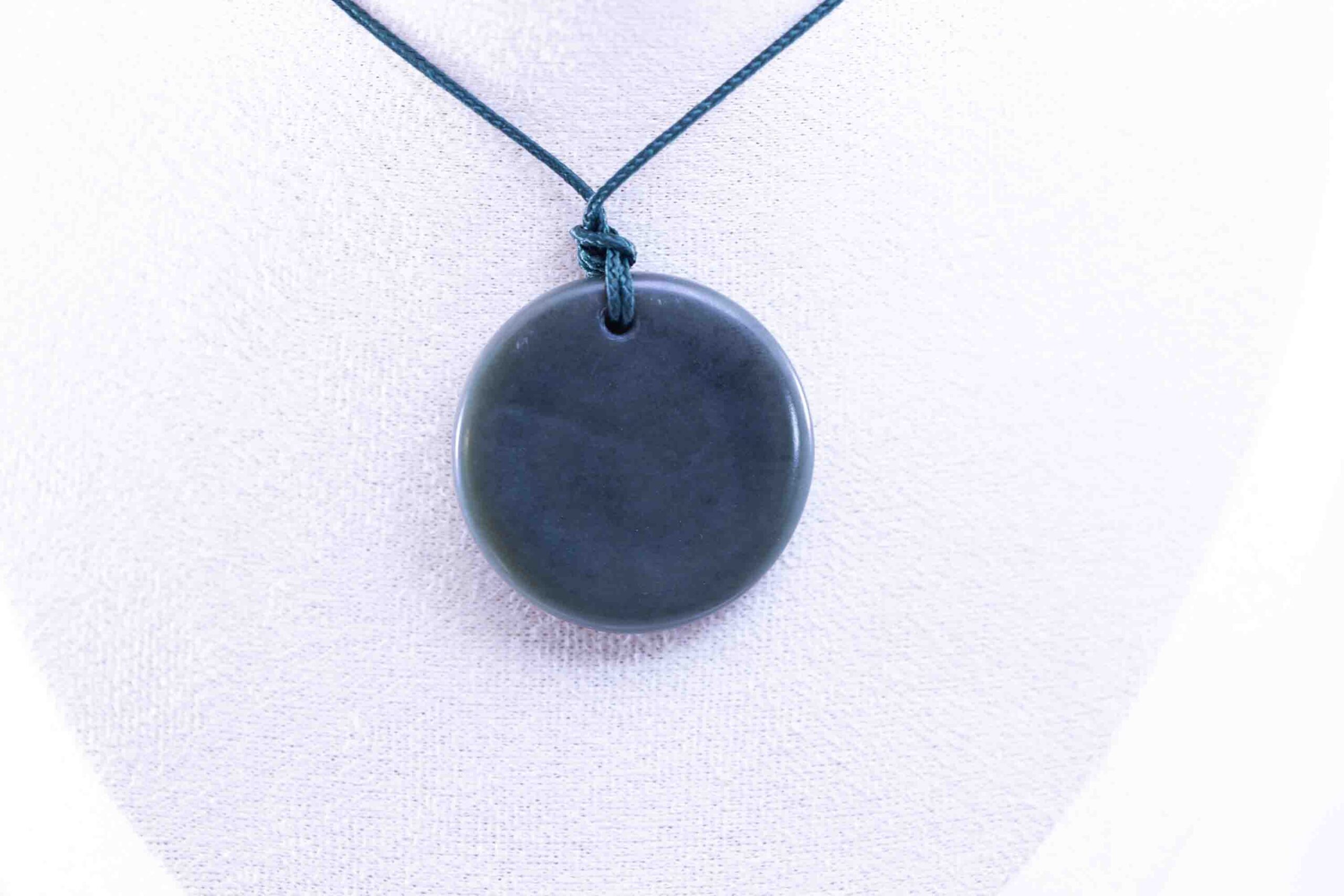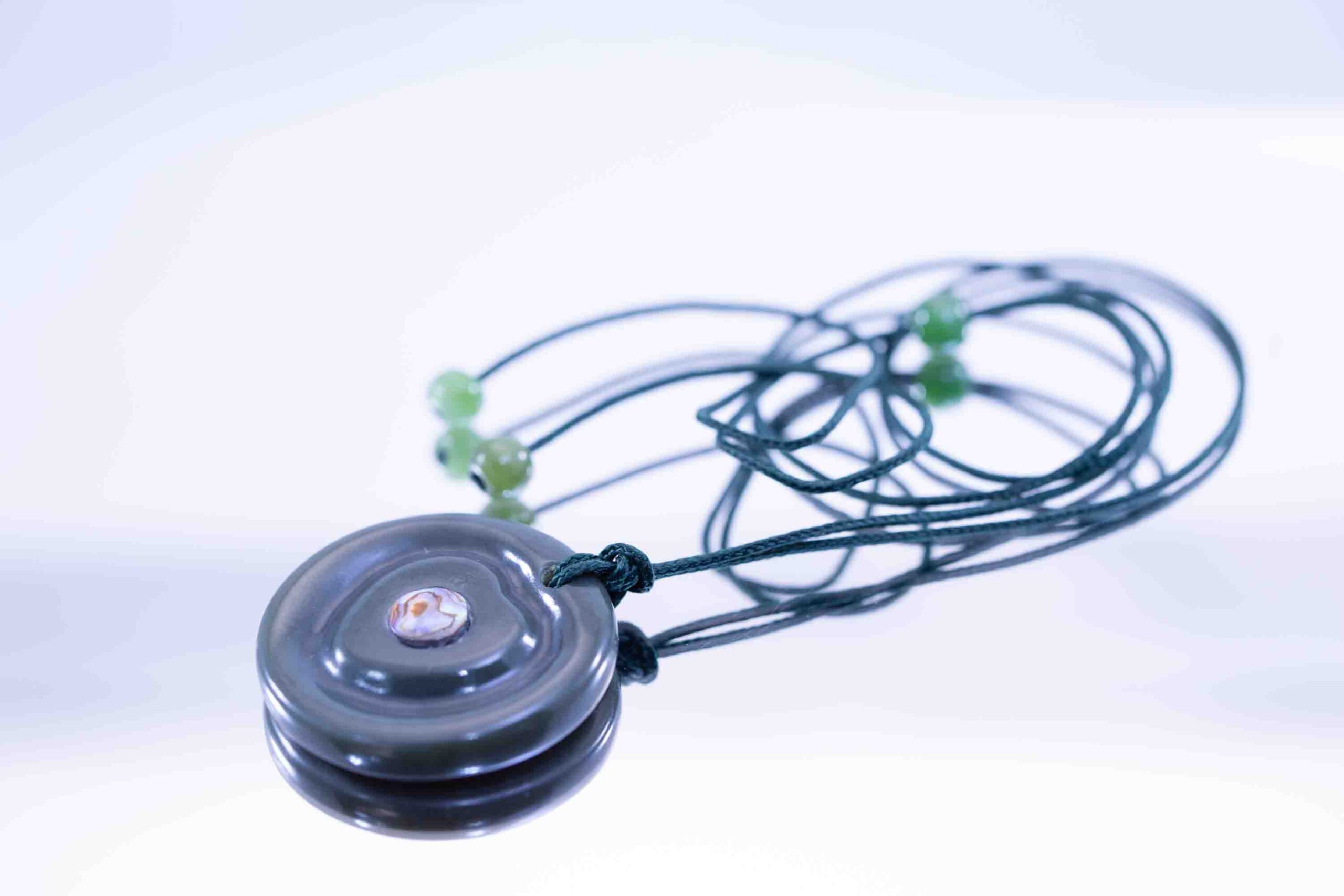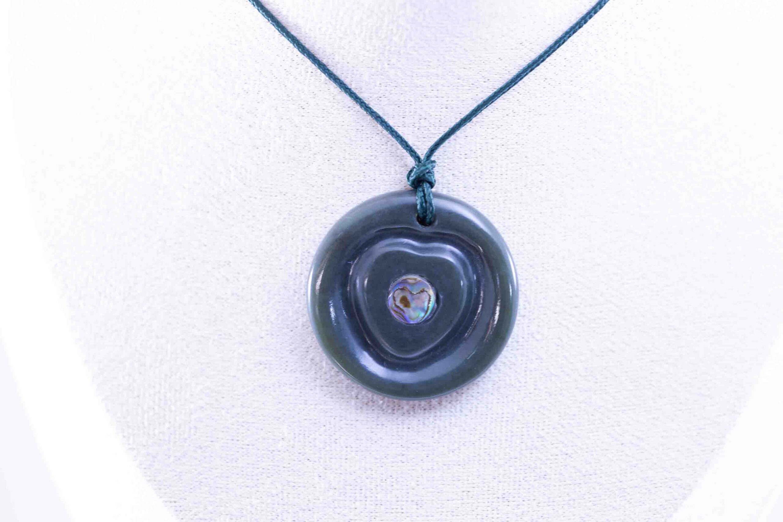 Hand-crafted with care, the smooth disc shape highlights the jade’s natural polish and durability, while the abalone inlay adds a symbolic and artistic focal point. The contrast between stone and shell creates a timeless design perfect for statement jewelry or meaningful keepsakes.