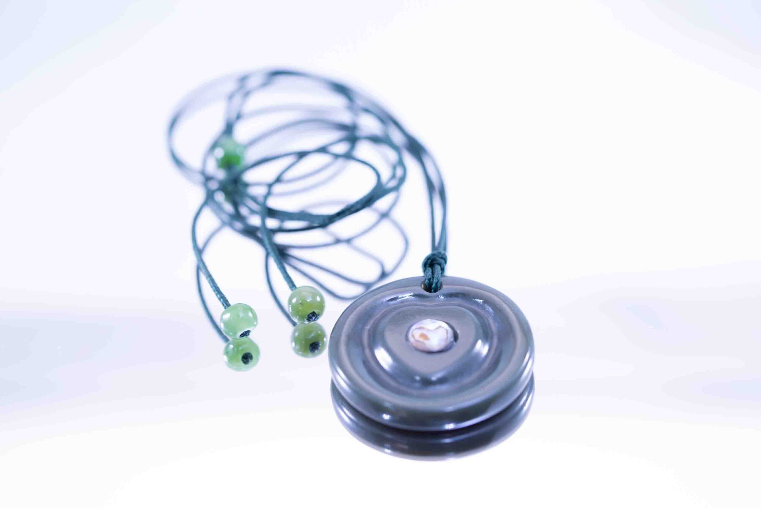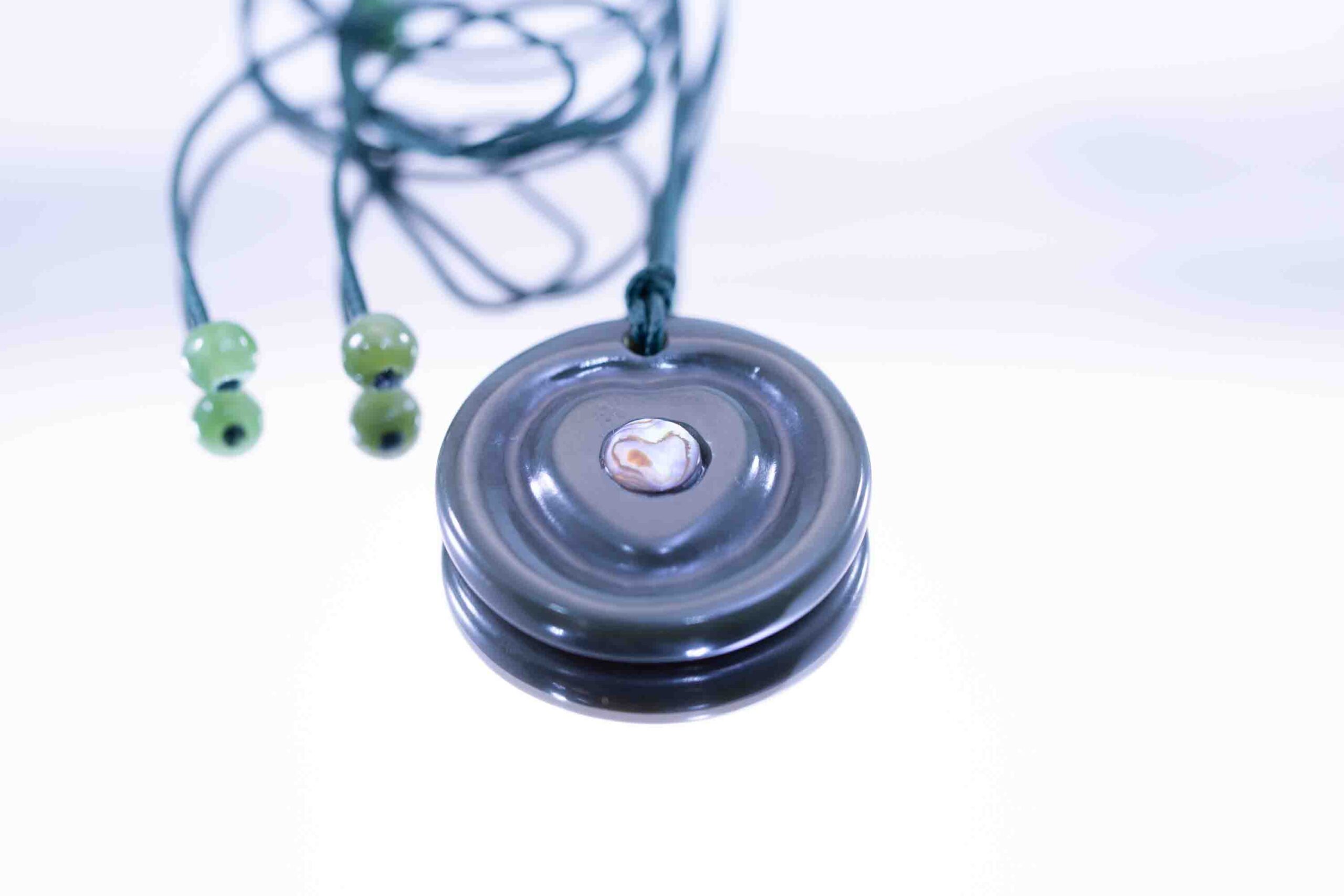 This Wyoming olive green jade disc features a luminous abalone shell heart inlay, creating a striking blend of earthy elegance and iridescent beauty. The natural jade displays soft olive-green tones with subtle variations, while the abalone heart shimmers with flashes of blue, violet, and sea-green—making each piece truly one of a kind.