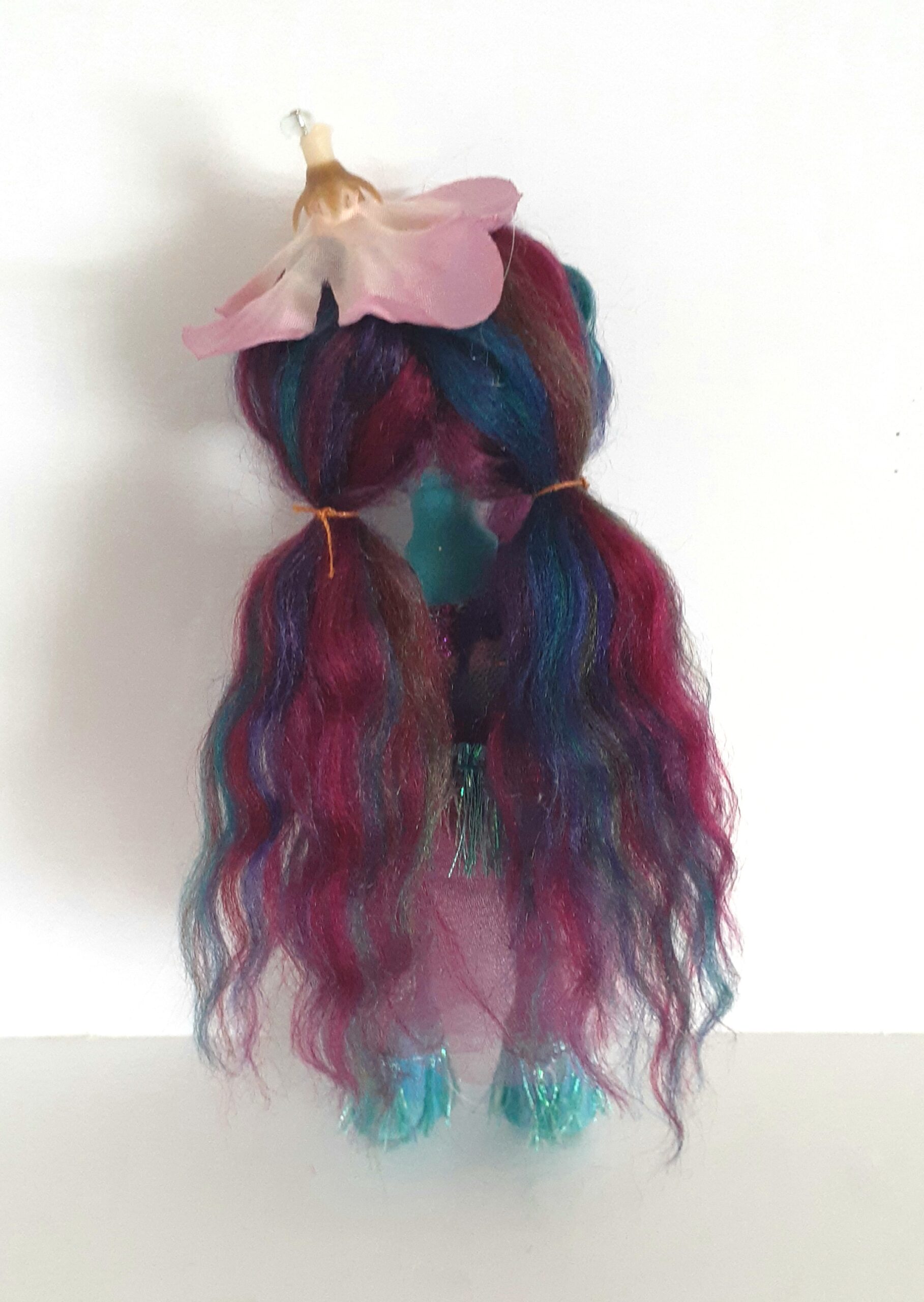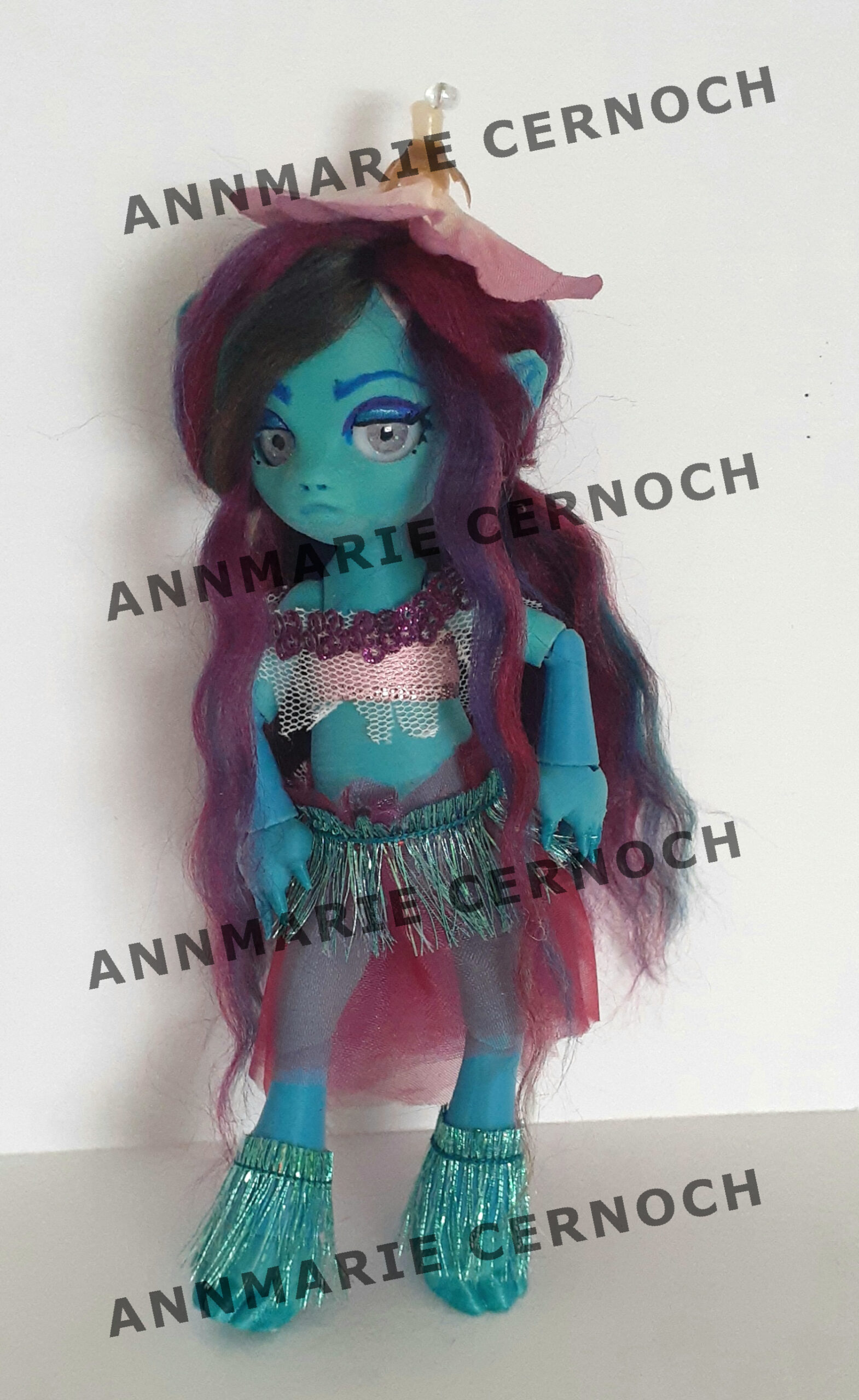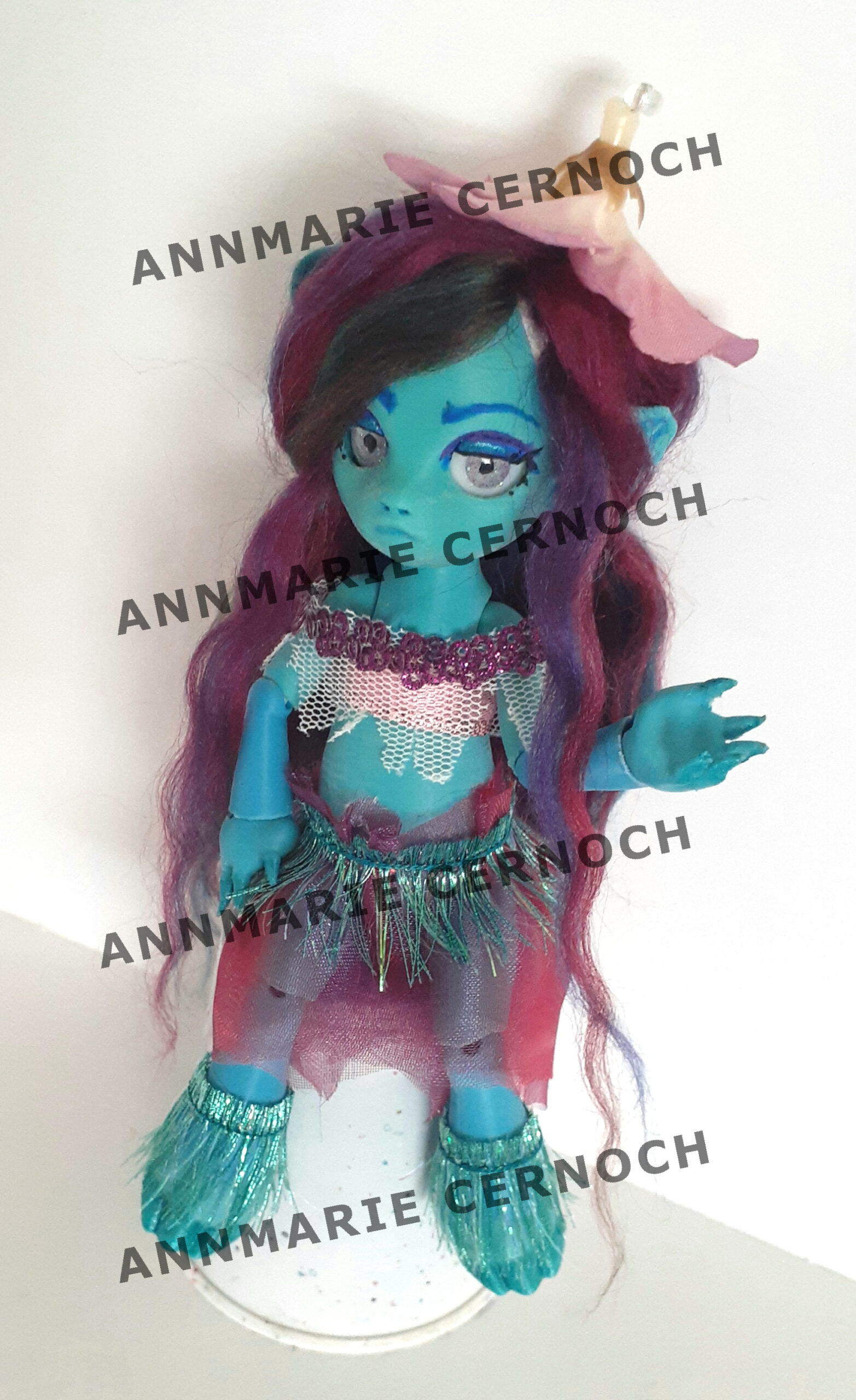 Evie is a sassy little spirit. She wont take crap from anyone and will bite your toes if you piss her off. So treat her with respect & space, just fyi. Evie is fully poseable. Her flower hat is no removable. Size: about 6 inch tall.