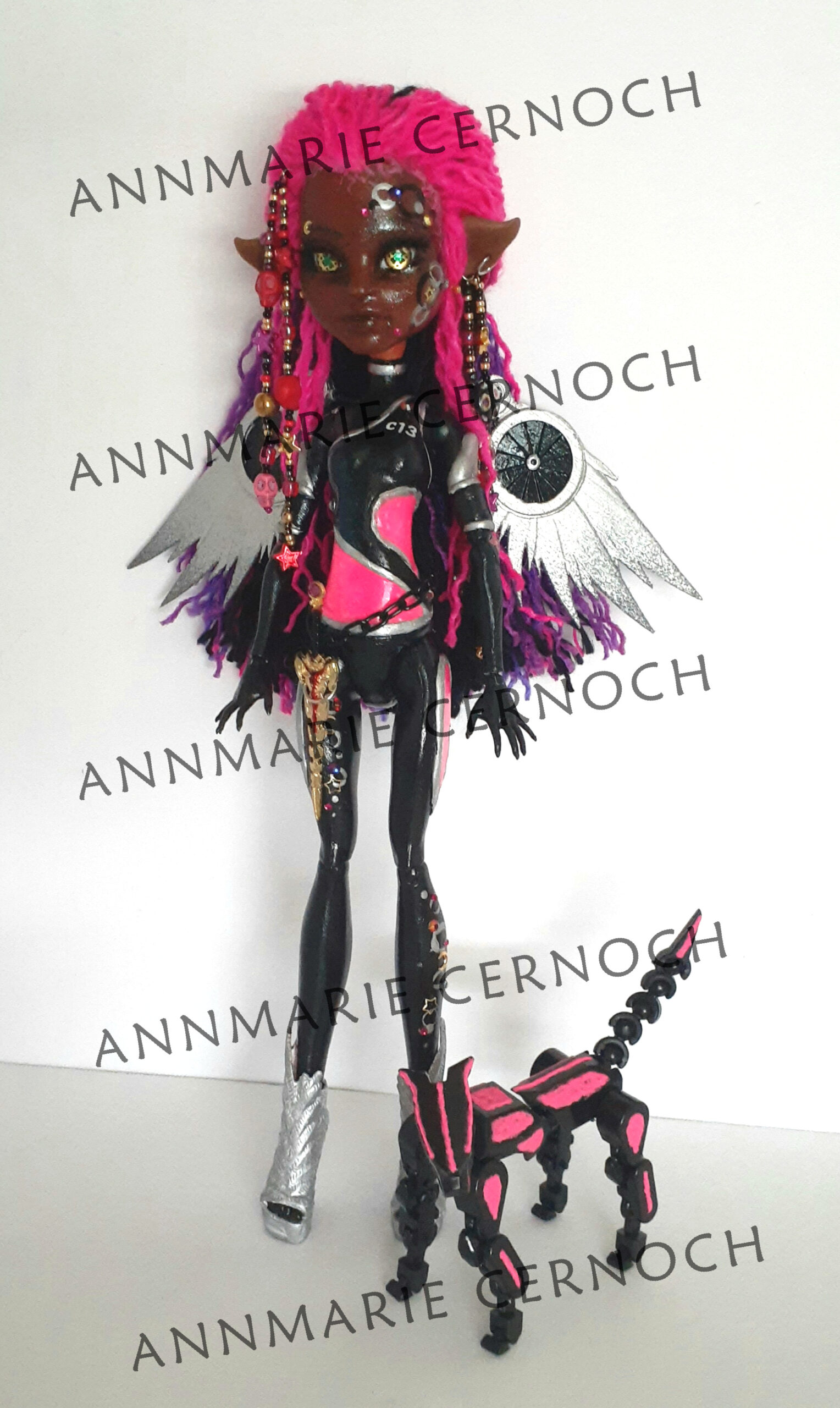 These beautifully detailed ooak dolls are designed and created by myself. Dolls have been rerooted, faceup, custom clothes & custom forearms. Details are hand painted. Any doll will be a very unique addition to your collection. Dolls & pets glow in the dark (with light charging). **All pets are fully articulated and pose-able.