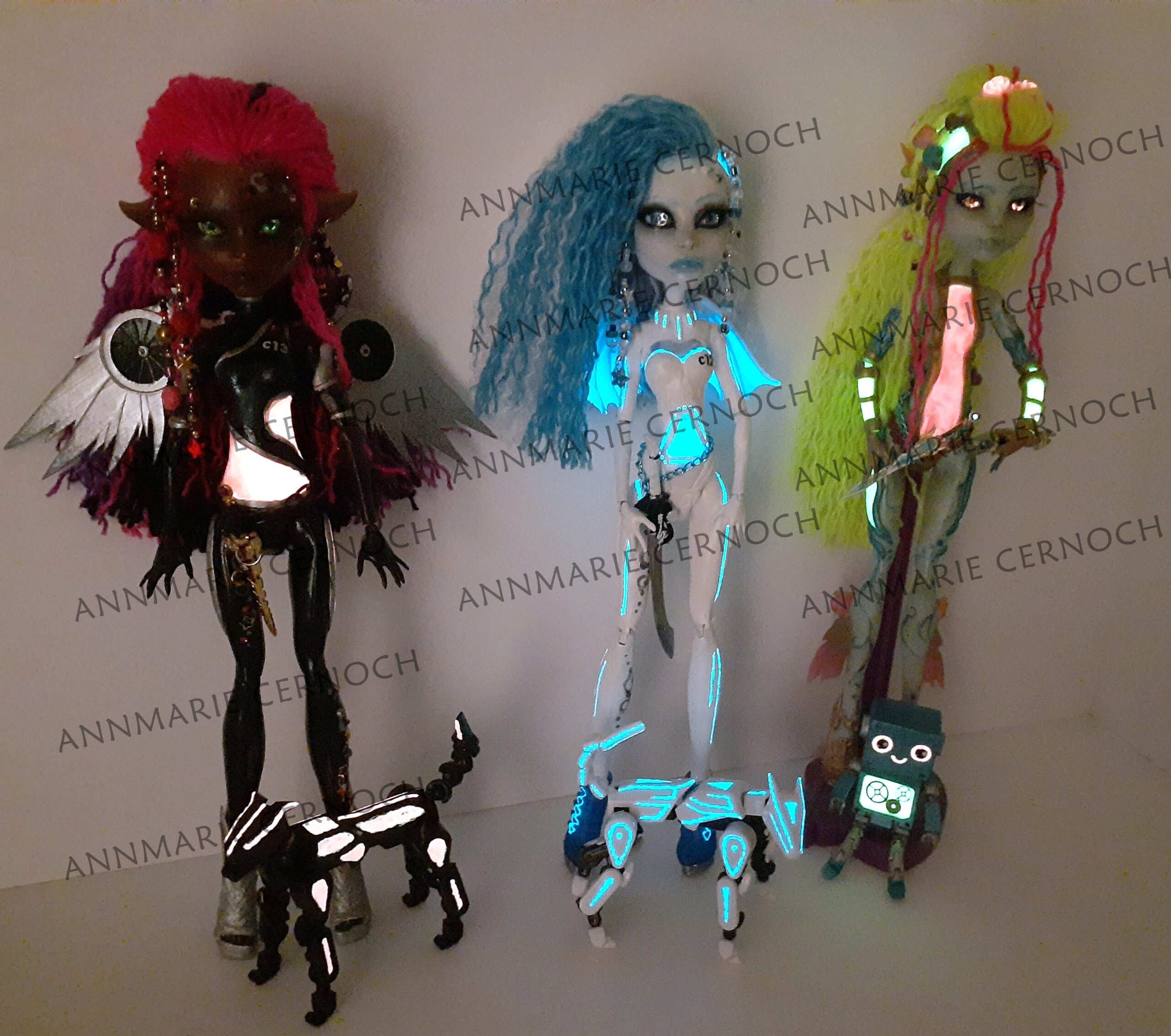 These beautifully detailed ooak dolls are designed and created by myself. Dolls have been rerooted, faceup, custom clothes & custom forearms. Details are hand painted. Any doll will be a very unique addition to your collection. Dolls & pets glow in the dark (with light charging). **All pets are fully articulated and pose-able.