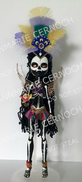 Carnival Skeleton: is ready to party away the afterlife! Unique in every way. She has deep yellow eyes and lovely metal wings. Her head piece is real feathers. Hand painted and custom right down to her gold sculpted heels.