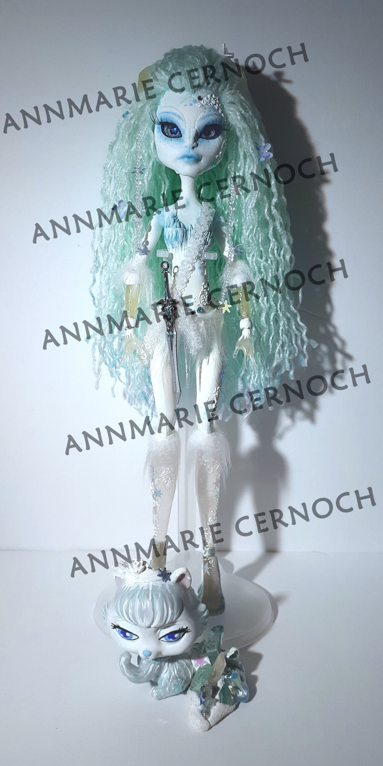 Winter- is the Snow Queen’s right hand woman and will protect her queen until death! She is unique in every way. From her crystal clear lower legs to her sculpted shoes/brassiere to her custom eyes/horns. She even has an icicle belt. So much detail all over. Her pampered snow cat is the purrrfect accompanying pet.