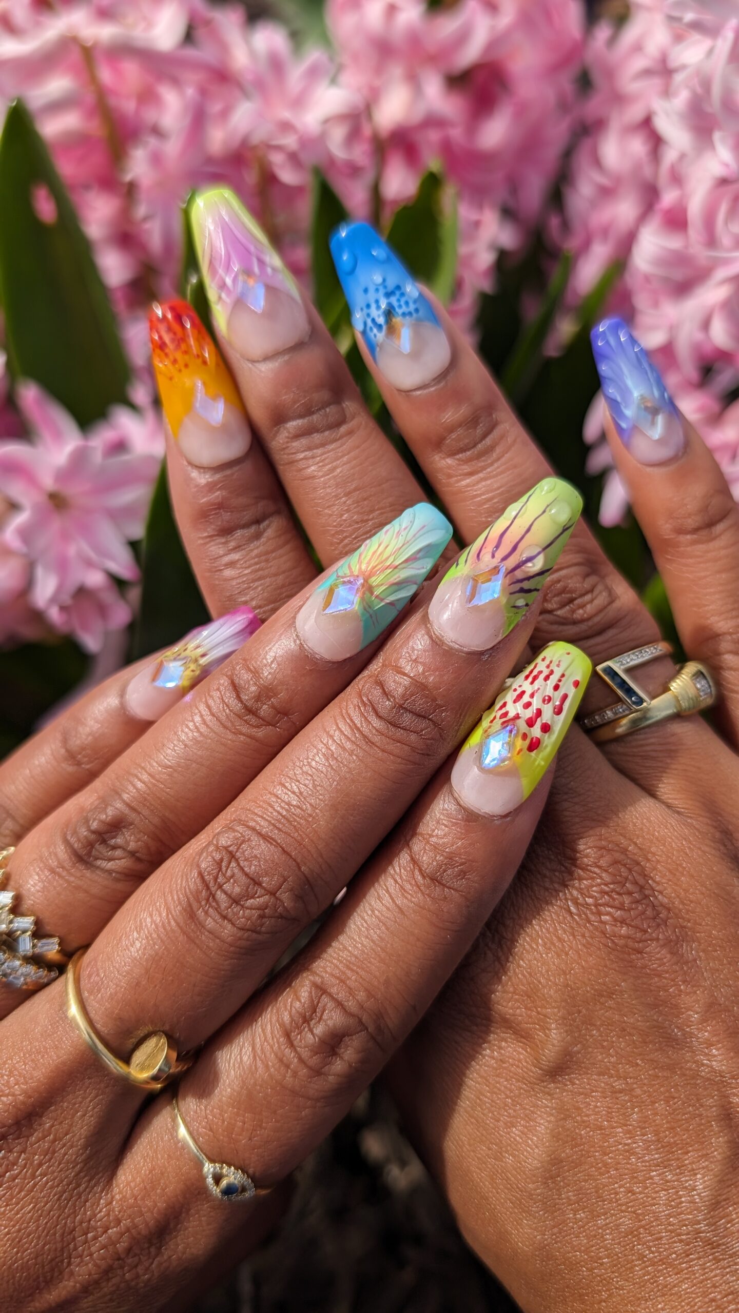 Tropical flowers are my love language. These orchid and lily inspired nails feature airbrushed auras, a cute French tip pattern and some subtle yet flashy Aurora rhinestones. The vacation nails of your dreams!