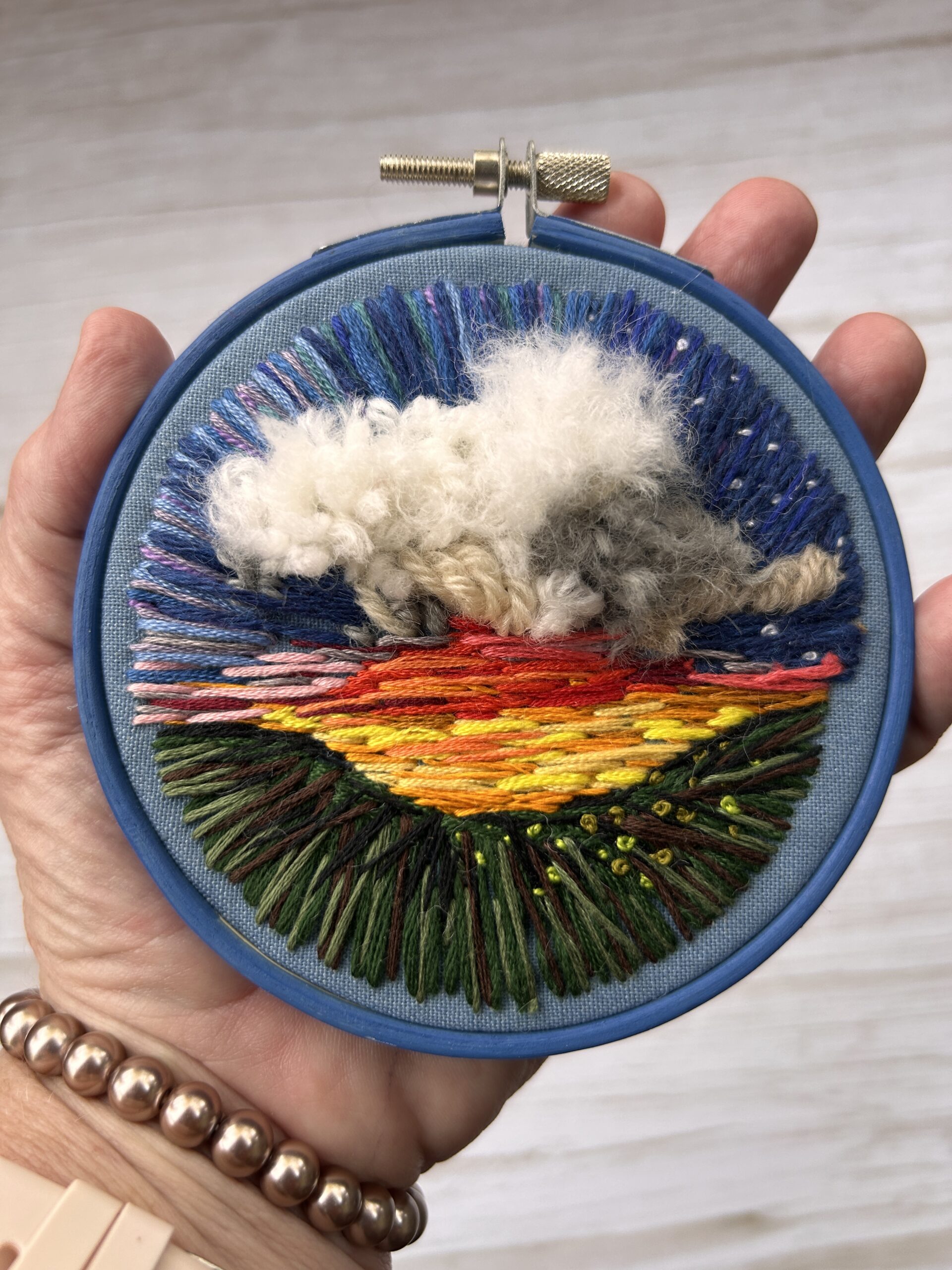 Tiny little 3 inch hand embroidered piece but absolutely not subtle. Puffy cloud, dramatic sunset, grassy foreground, all stitched like it’s processing something.