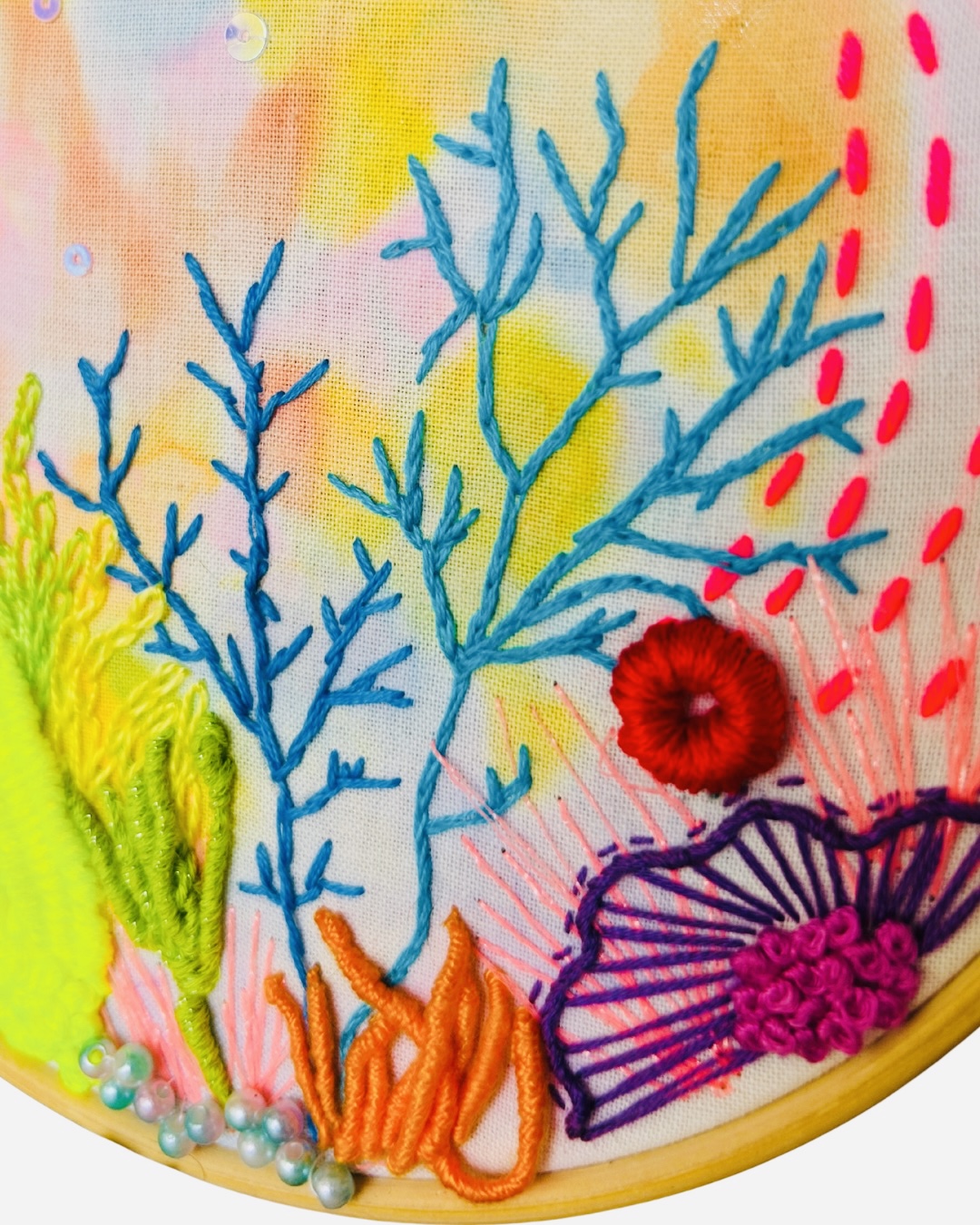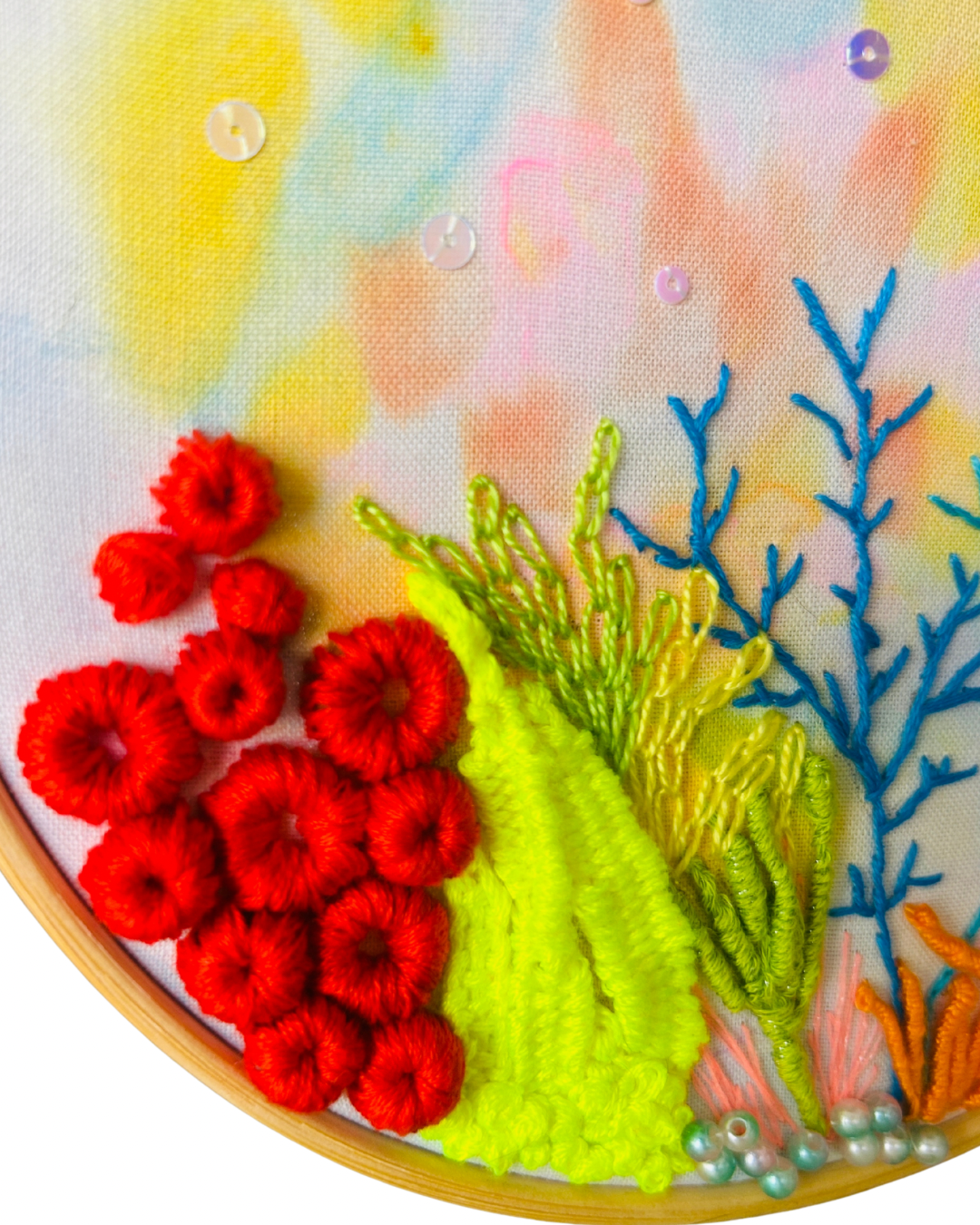Hand painted watercolor on fabric gave that soft, swirly ocean glow, then stitched up into a tiny coral party. Bright sea plants, playful textures, sparkly details, because have you met me? If it’s possible to add more color and sparkles, I always do.