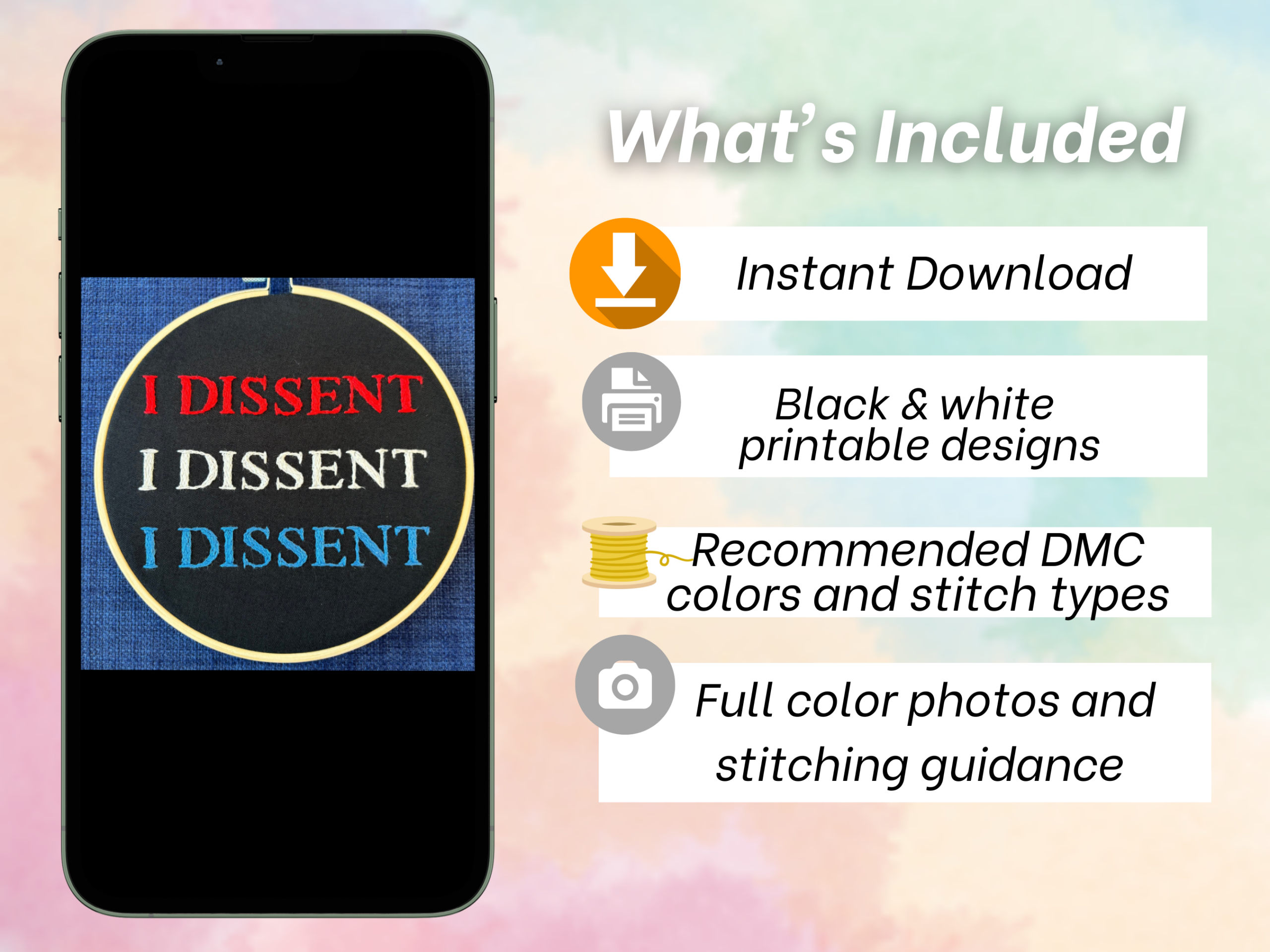 Patriotic I Dissent Hand Embroidery Pattern: Red, White, and Blue (PDF Digital Download)