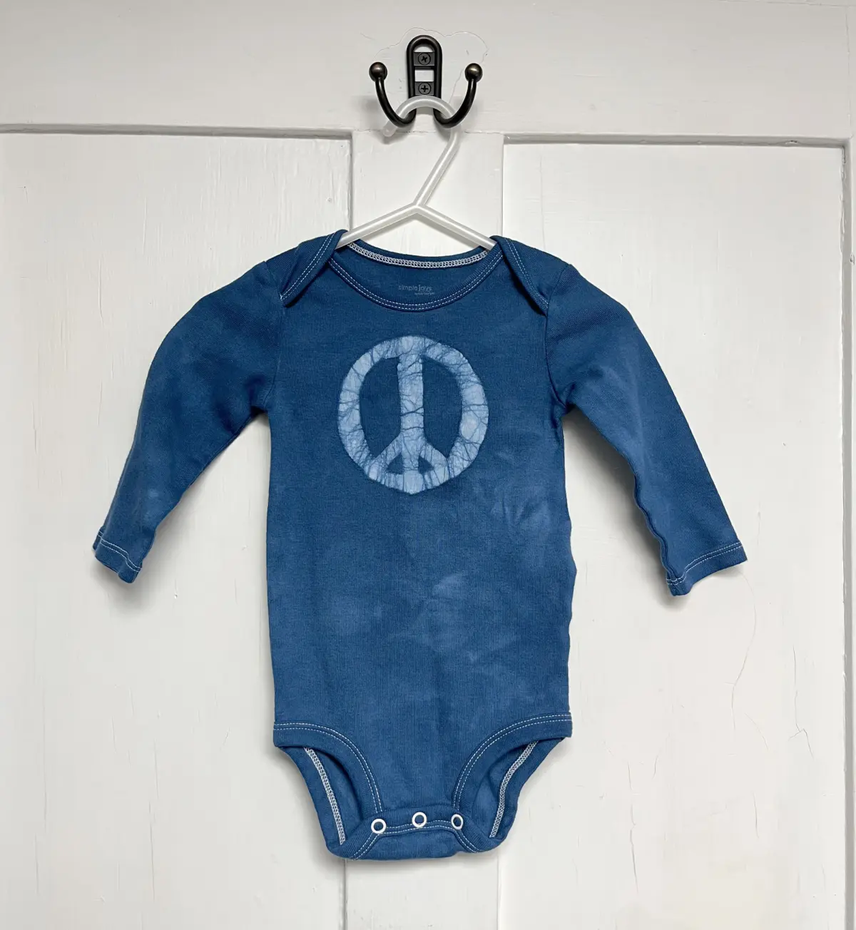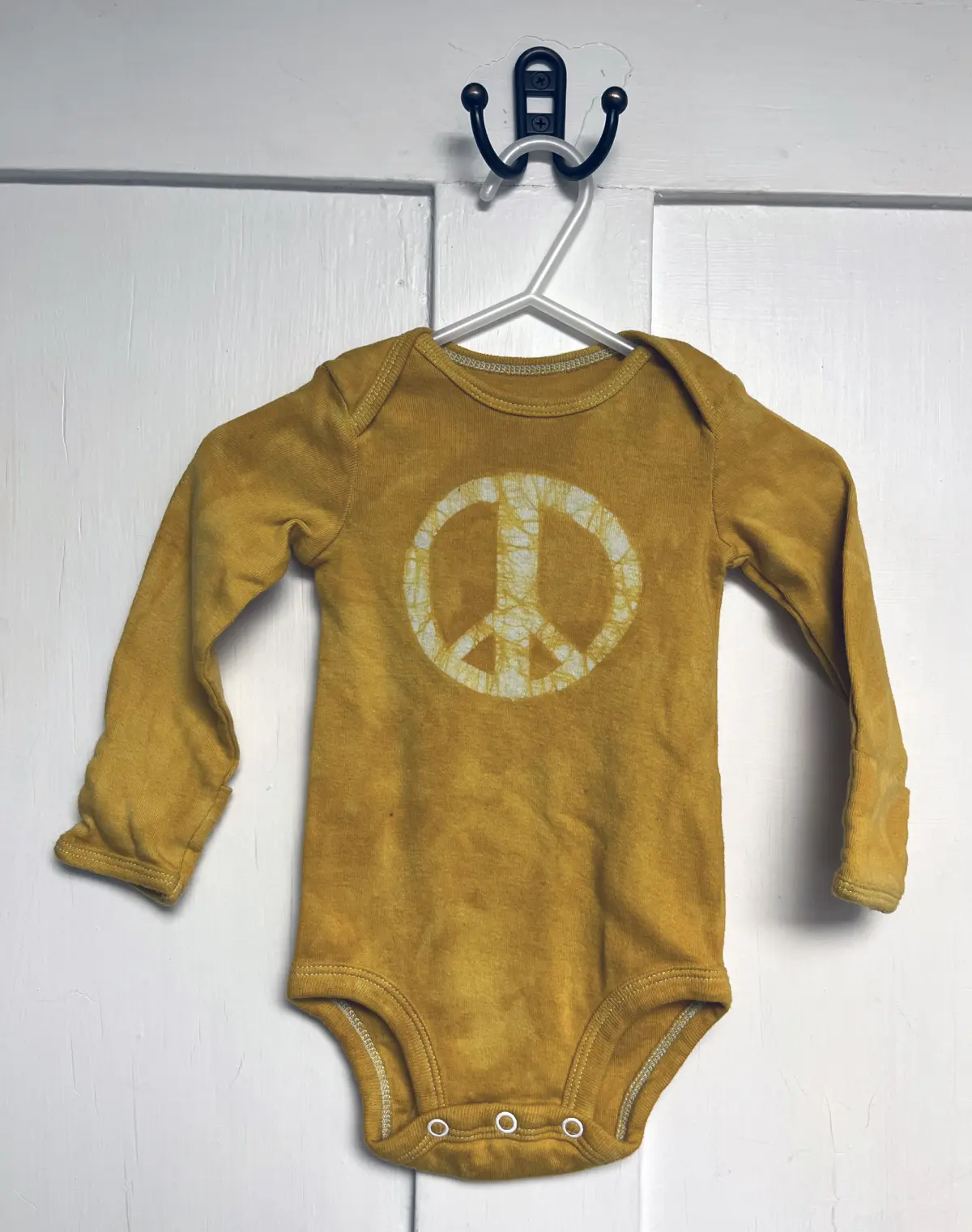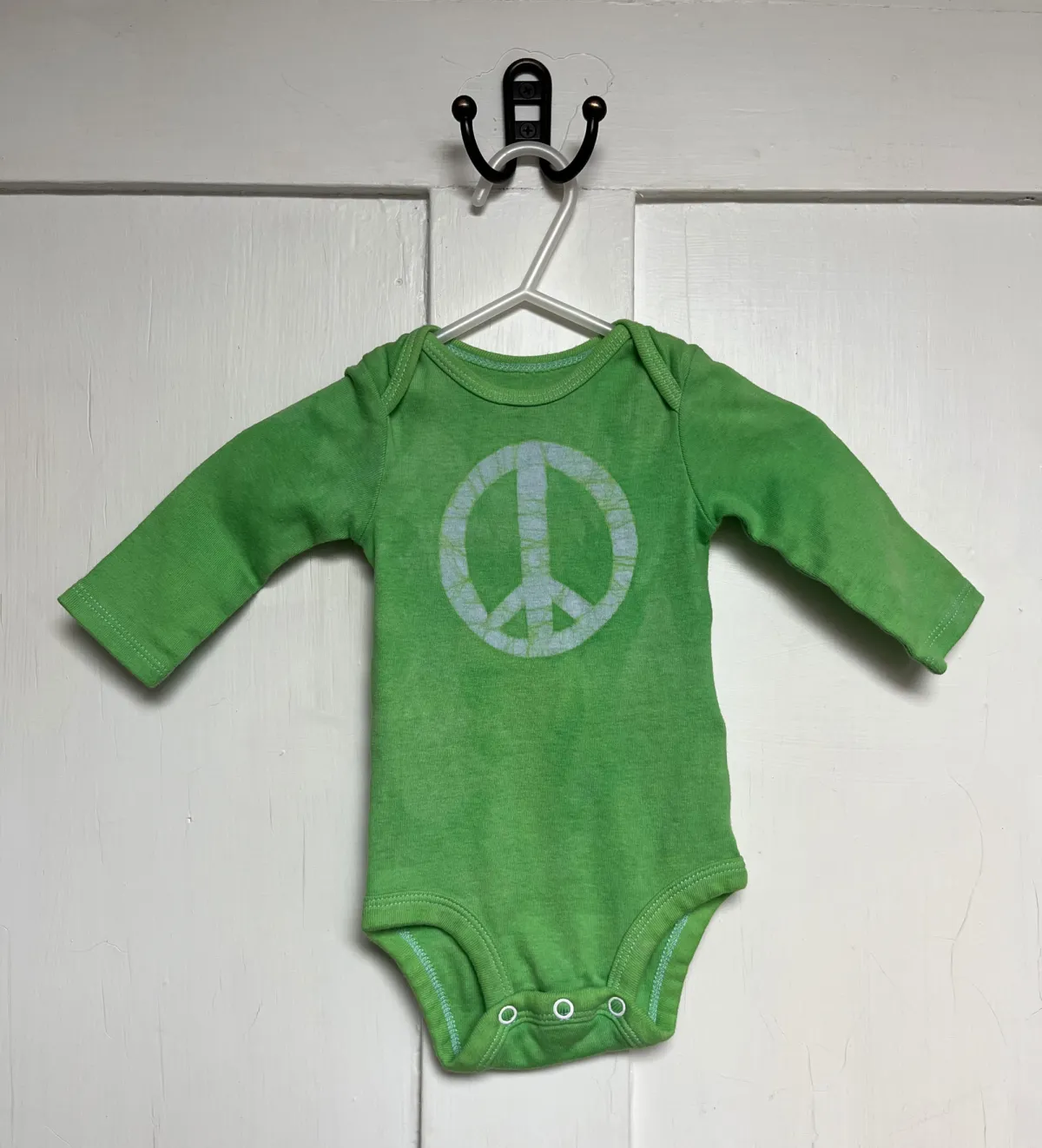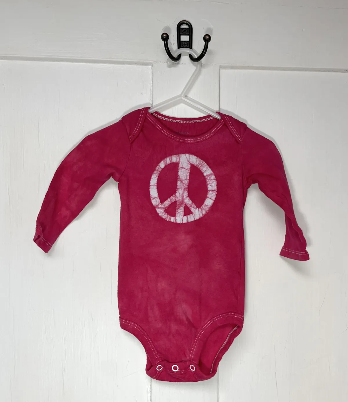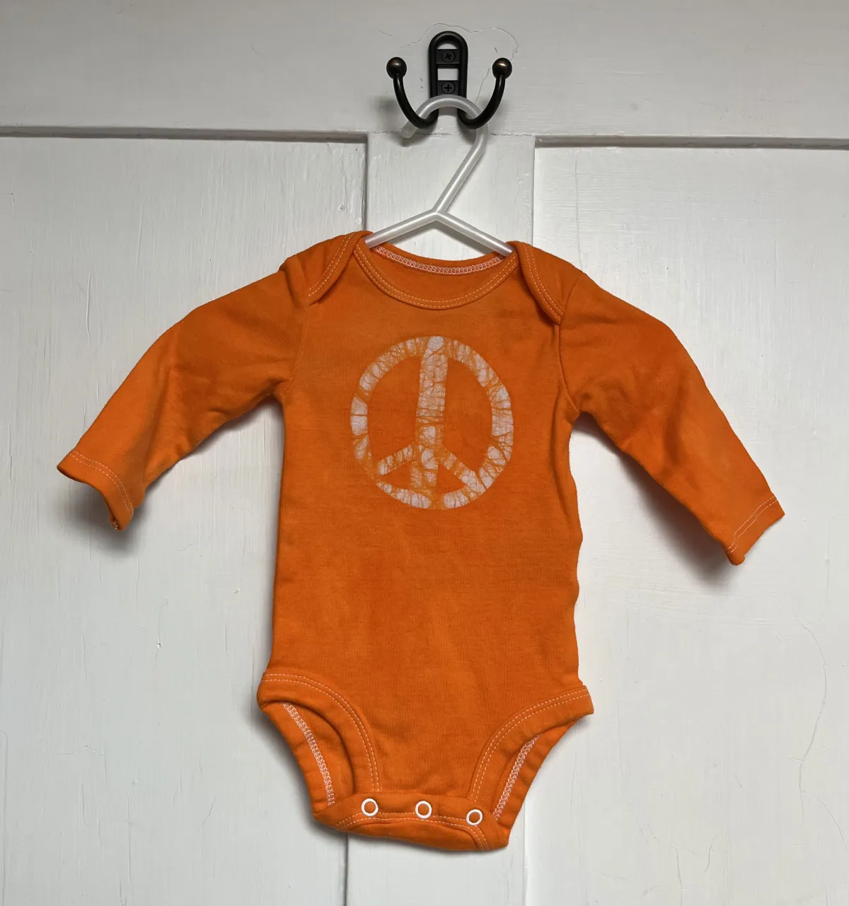 The peace sign is back in a big way, and I love it on little peace babies! For these made-to-order baby bodysuits, I draw a big peace sign onto the chest of a long sleeve Carter’s or Simple Joys by Carter’s brand bodysuit before dyeing it the color of your choice.
