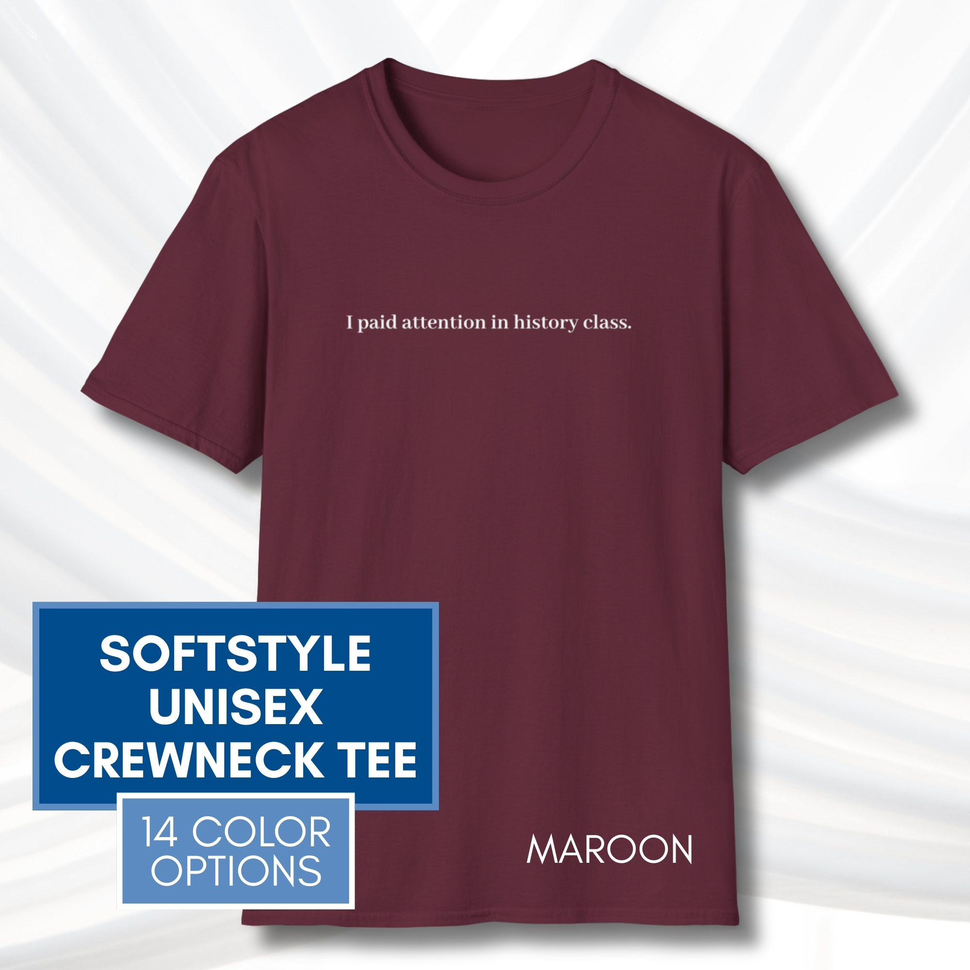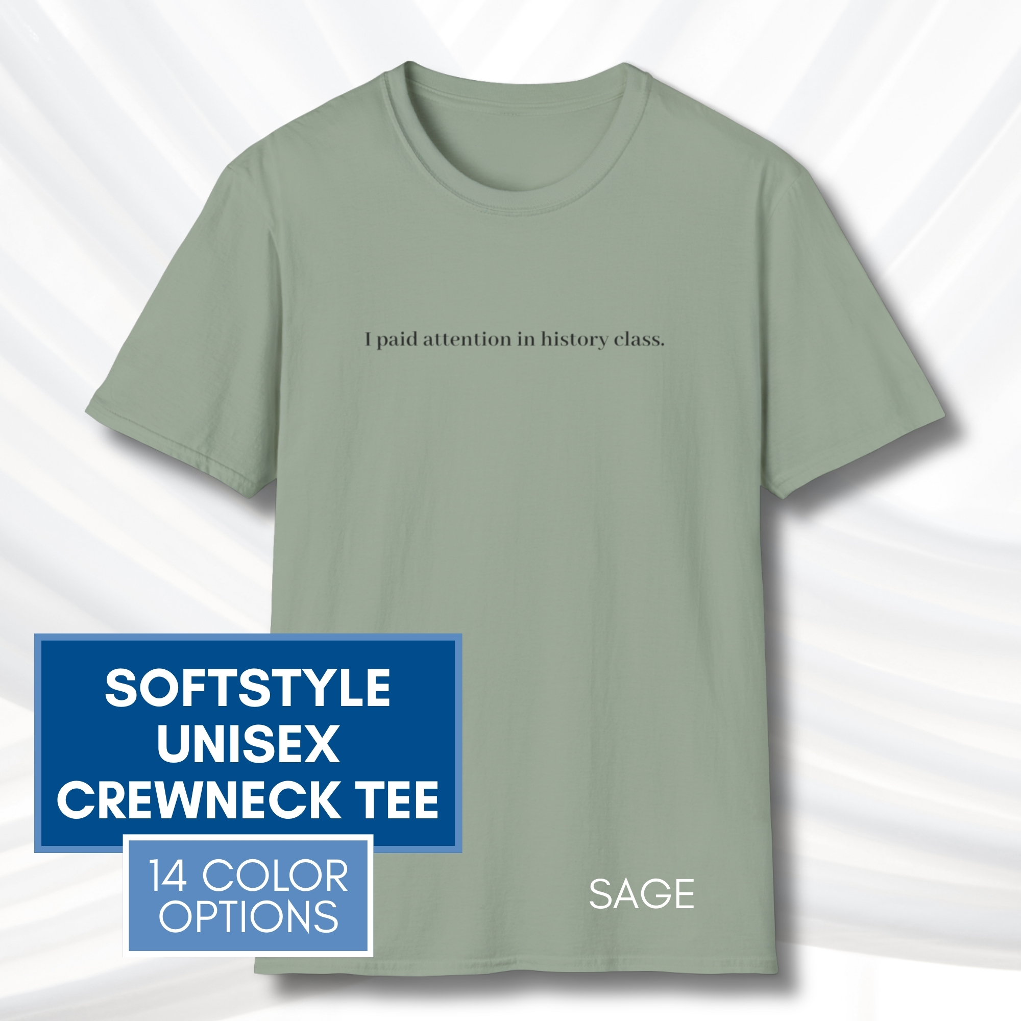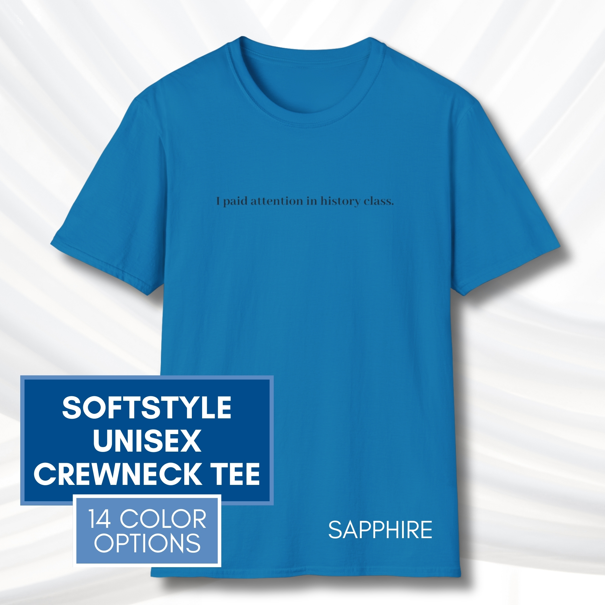 Unisex Gildan Softstyle Short Sleeve Tee. “I paid attention in history class.” $2 from every shirt sold through Little Blue Market will be donated to Everytown for Gun Safety.