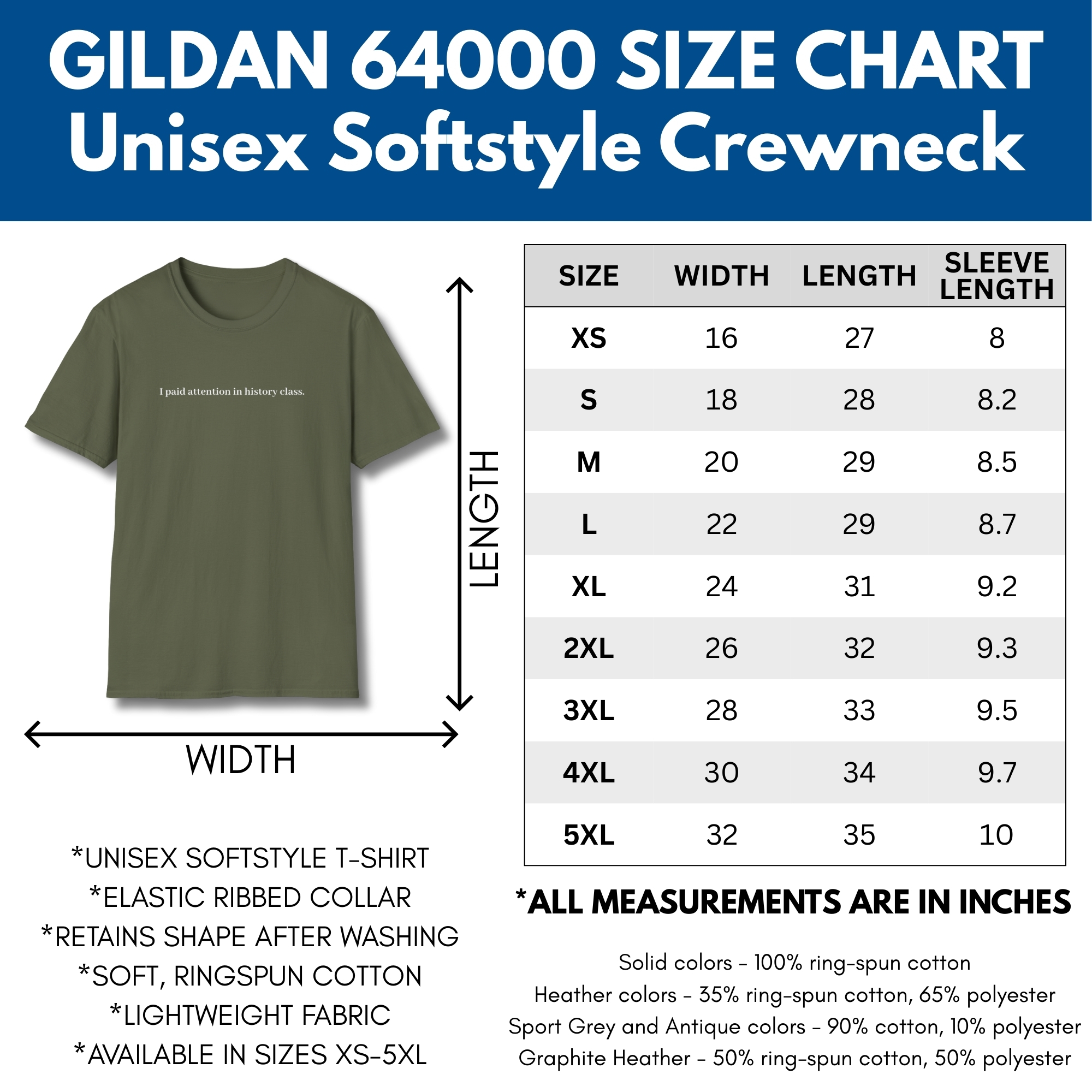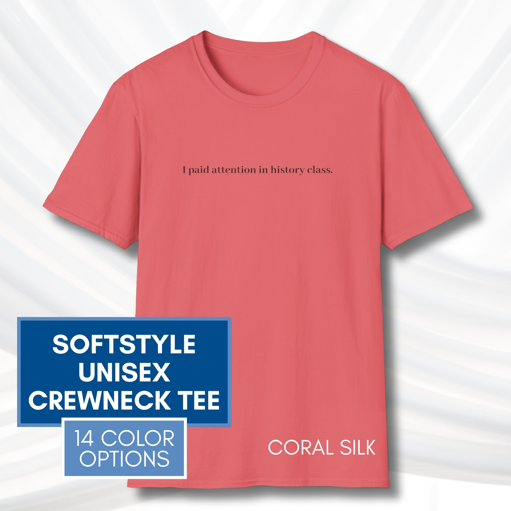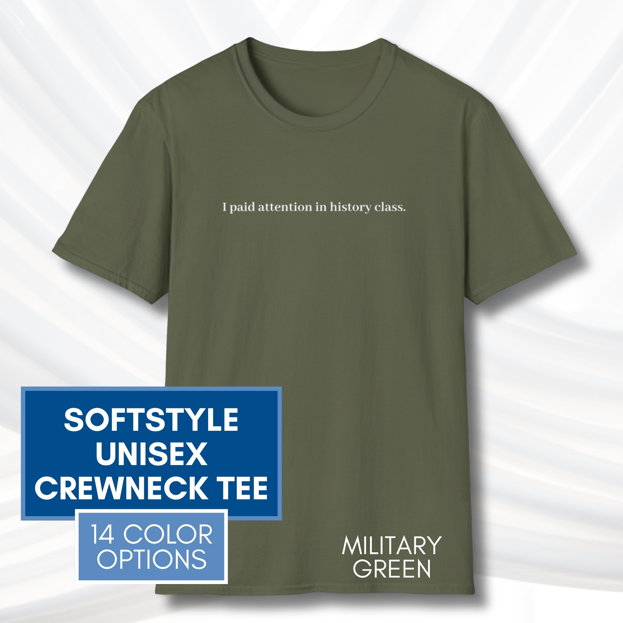 Unisex Gildan Softstyle Short Sleeve Tee. “I paid attention in history class.” $2 from every shirt sold through Little Blue Market will be donated to Everytown for Gun Safety.