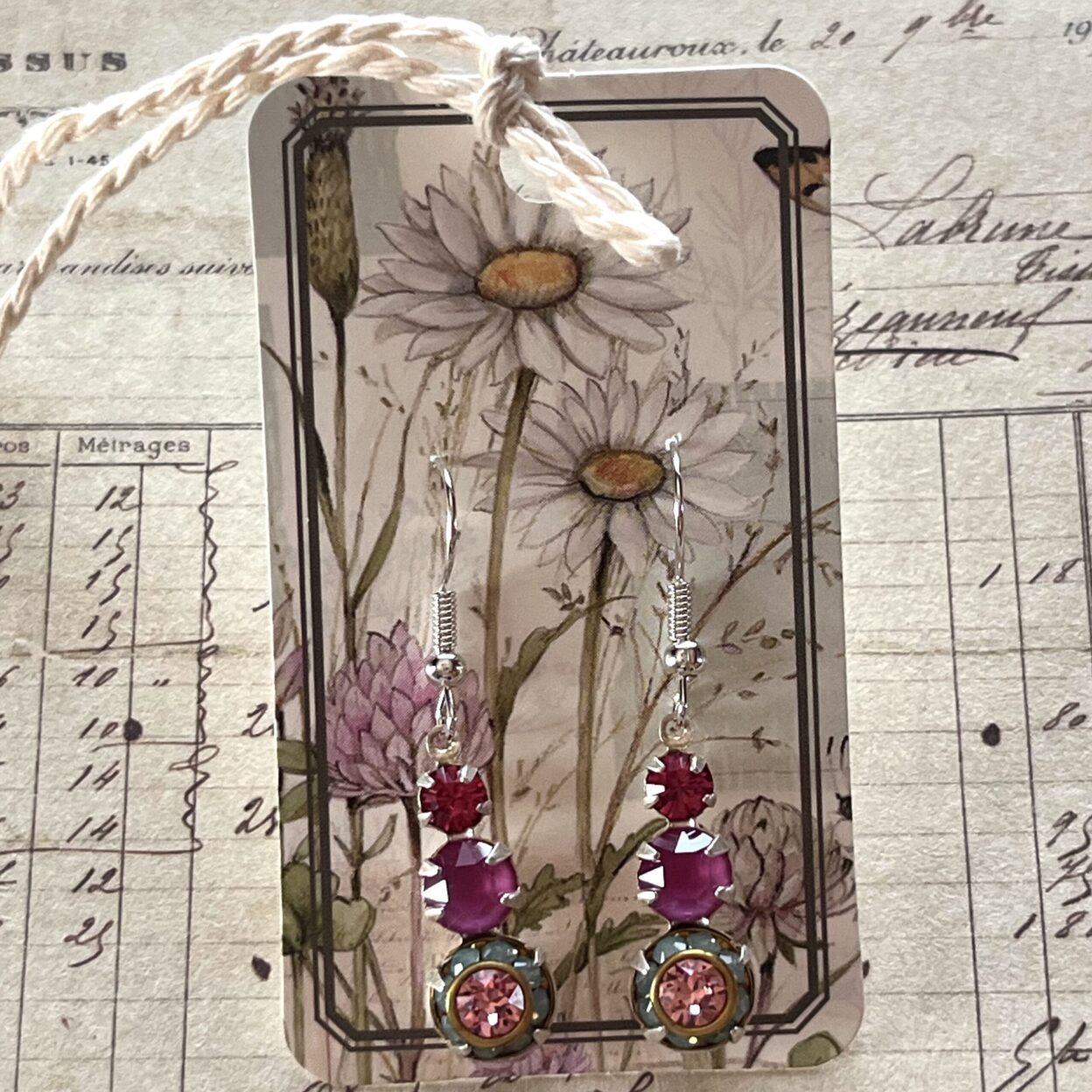 Vintage-inspired three-stone drop earrings measuring approximately 1.5 inches in length, featuring genuine vintage Austrian crystals in soft pink and Pacific opal tones. Set in antiqued silver with silver-plated French hook earwires, they’re lightweight, romantic, and effortlessly wearable.
