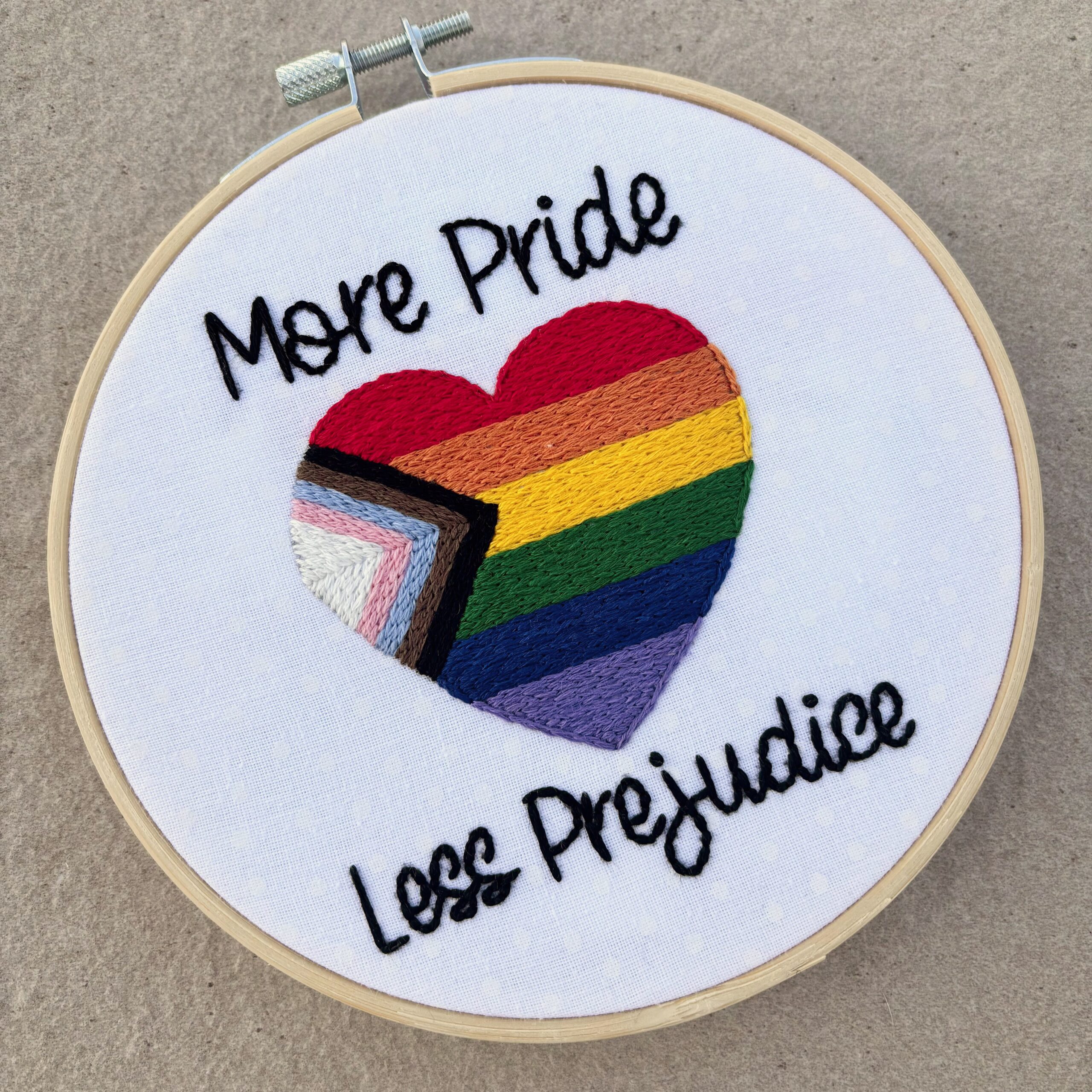 “More Pride Less Prejudice.” This quote playing on Jane Austen’s Pride and Prejudice warms my wordplay and book loving heart. It’s a great way to show your pride or your allyship, to welcome people into your home, and it is perfect for similarly inclusive / strong / intersectional feminist / loving / proud / joyful / literary people in your life! I turned the progress pride flag into a heart and sewed the whole thing on white polka dotted cotton. I think it would also be fun on a tee shirt, bag, or handkerchief! Perfect for librarians and English teachers 🙂 No AI in this design process!