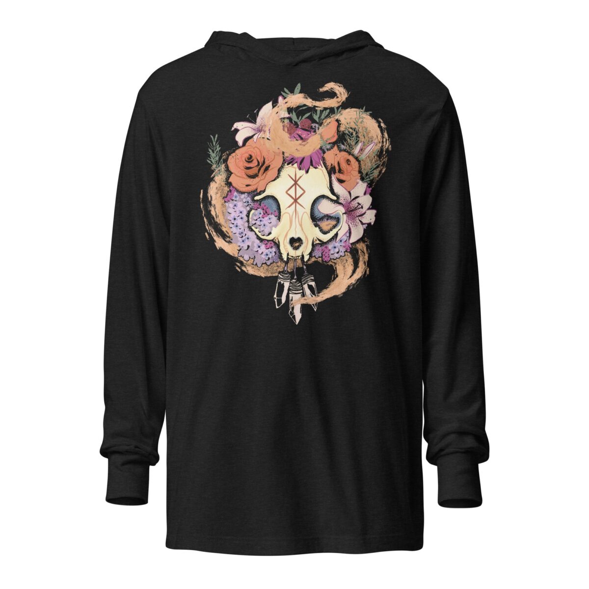 With Samhain approaching— Halloween for the unfamiliar—brace yourself as the boundary between the living and the dead thins. This design features a protection rune etched on a cat skull, surrounded by Roses, Lilies, Lilacs, and crystals to defend you through this mystical season. With its long sleeves and comfortable hood, this tee is perfect for layering, allowing you to create stylish outfits all year round. Plus, its lightweight construction allows for unrestricted movement, ensuring that you feel at ease no matter the occasion.