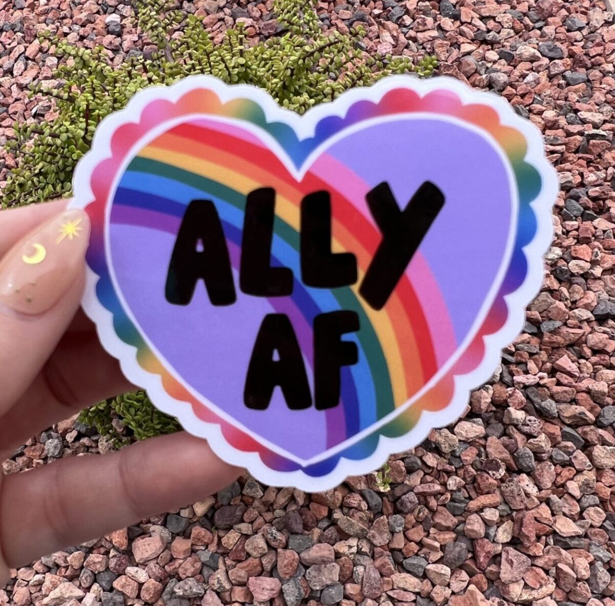 Show up loud, proud, and Ally AF with this bold and colorful heart-shaped sticker! Featuring a vibrant rainbow on a lilac background with black block lettering, this sticker is perfect for LGBTQIA+ allies who want to speak up and show love. Whether you’re decorating your laptop, water bottle, planner, or car window, this glossy sticker makes your support crystal clear.
