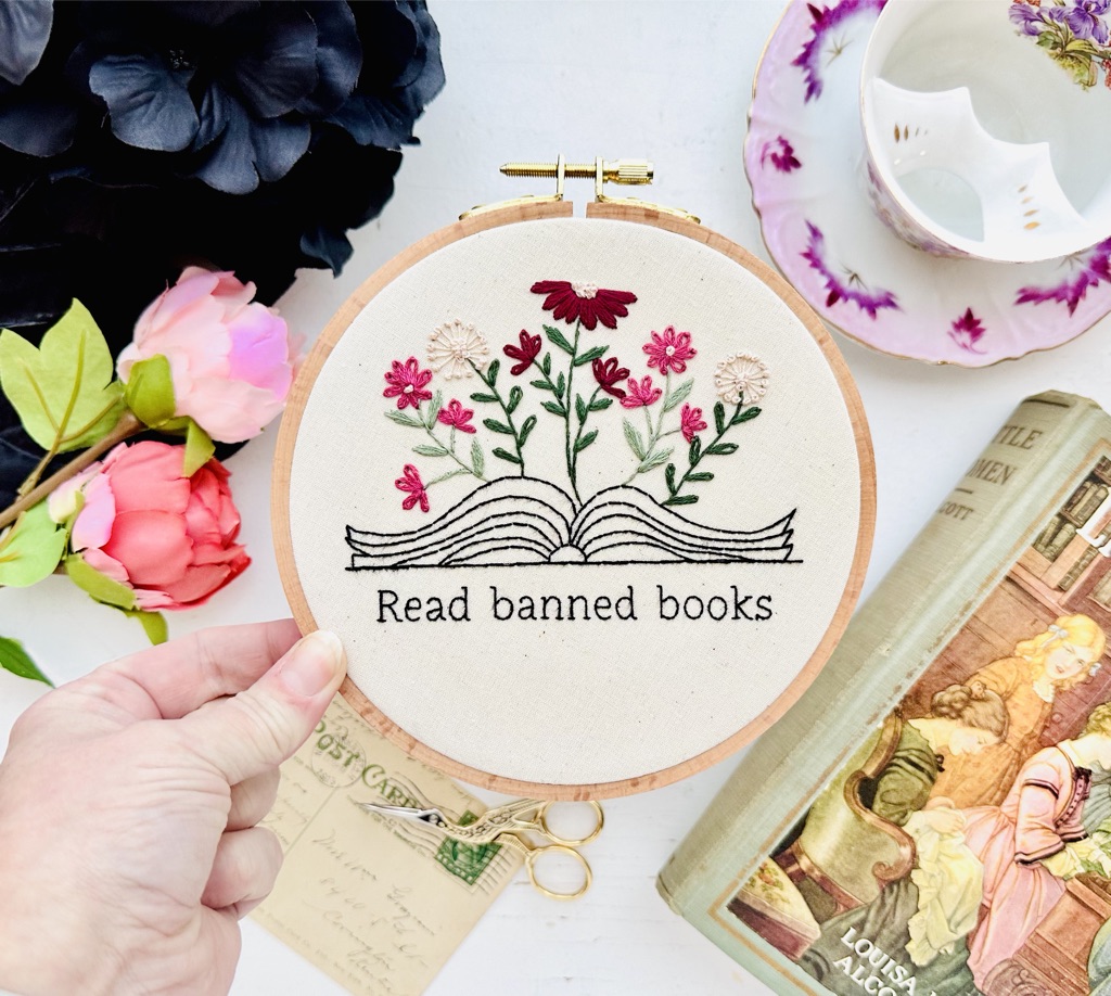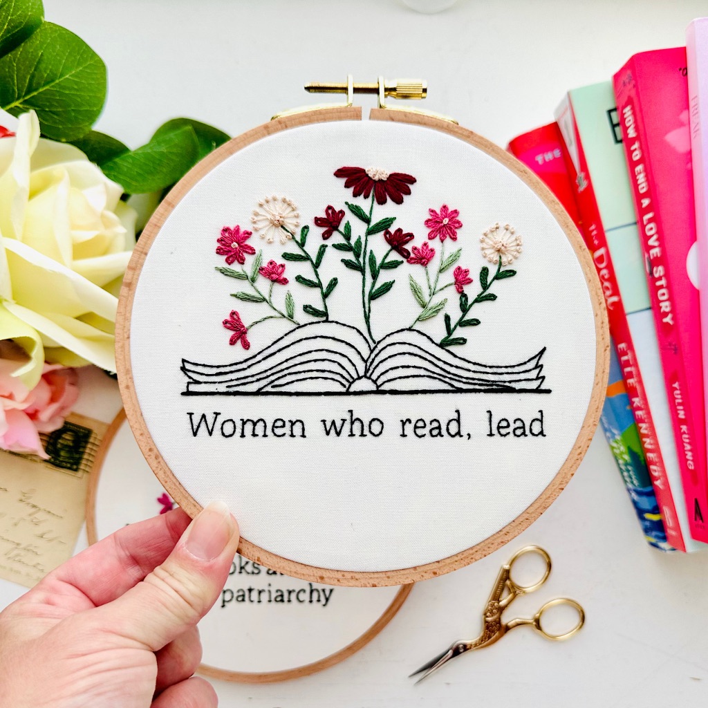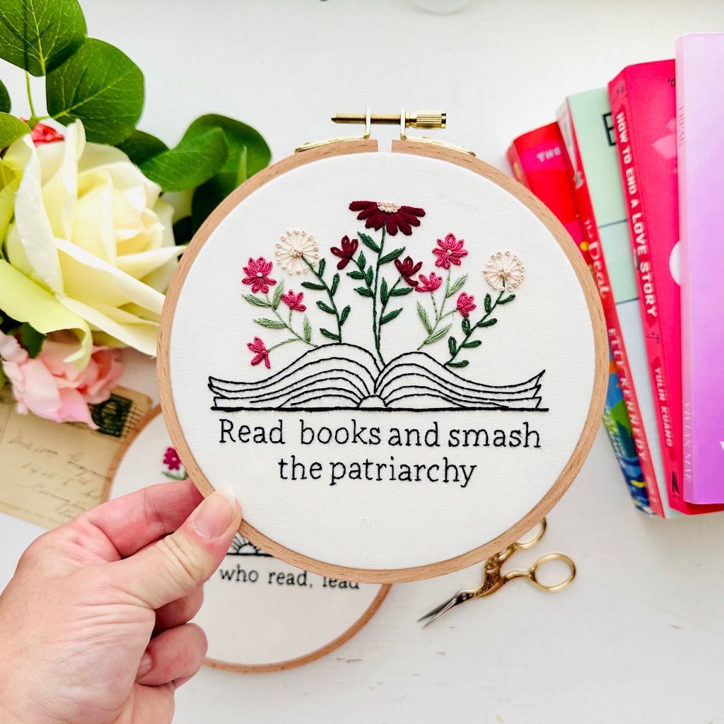 This is a PDF Pattern only. This is my own design and includes all stitches and DMC thread numbers. This is a pattern set that includes 7 different phrases with the same book graphic. The phrases are: Read more books by women, Libby and chill, Read banned books, Why be a victim when you can be a murderer?, Read hot girl shit, Women who read, lead, and Read books and smash the patriarchy.