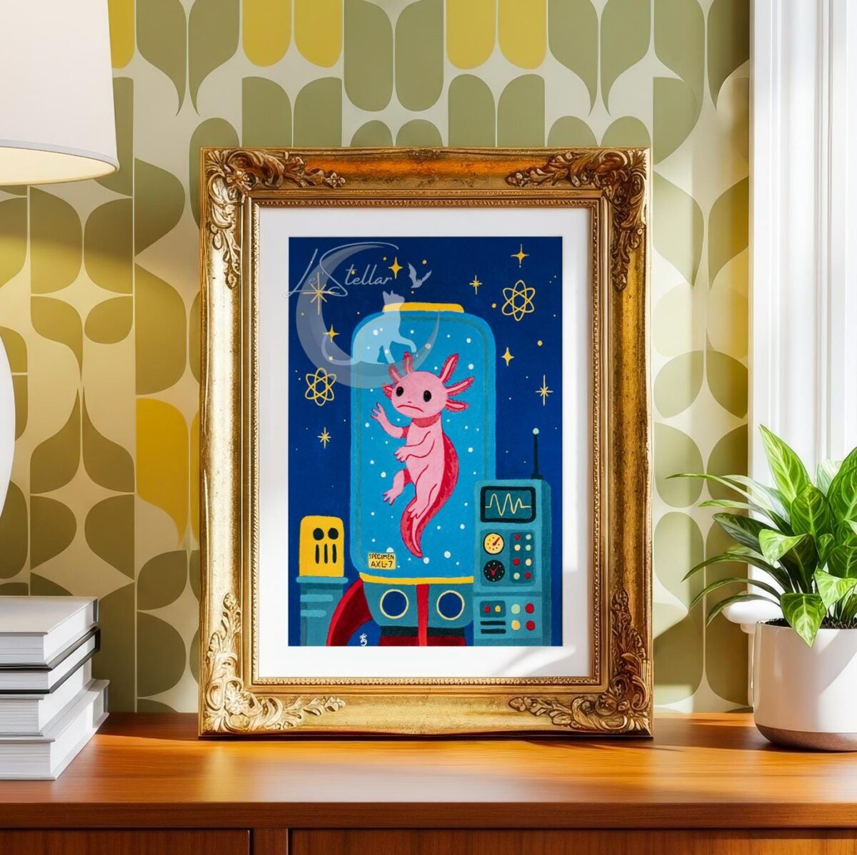 Retro Axolotl Acrylic Painting Print: Fantasy Atomic Age Hand-Painted Wall Art