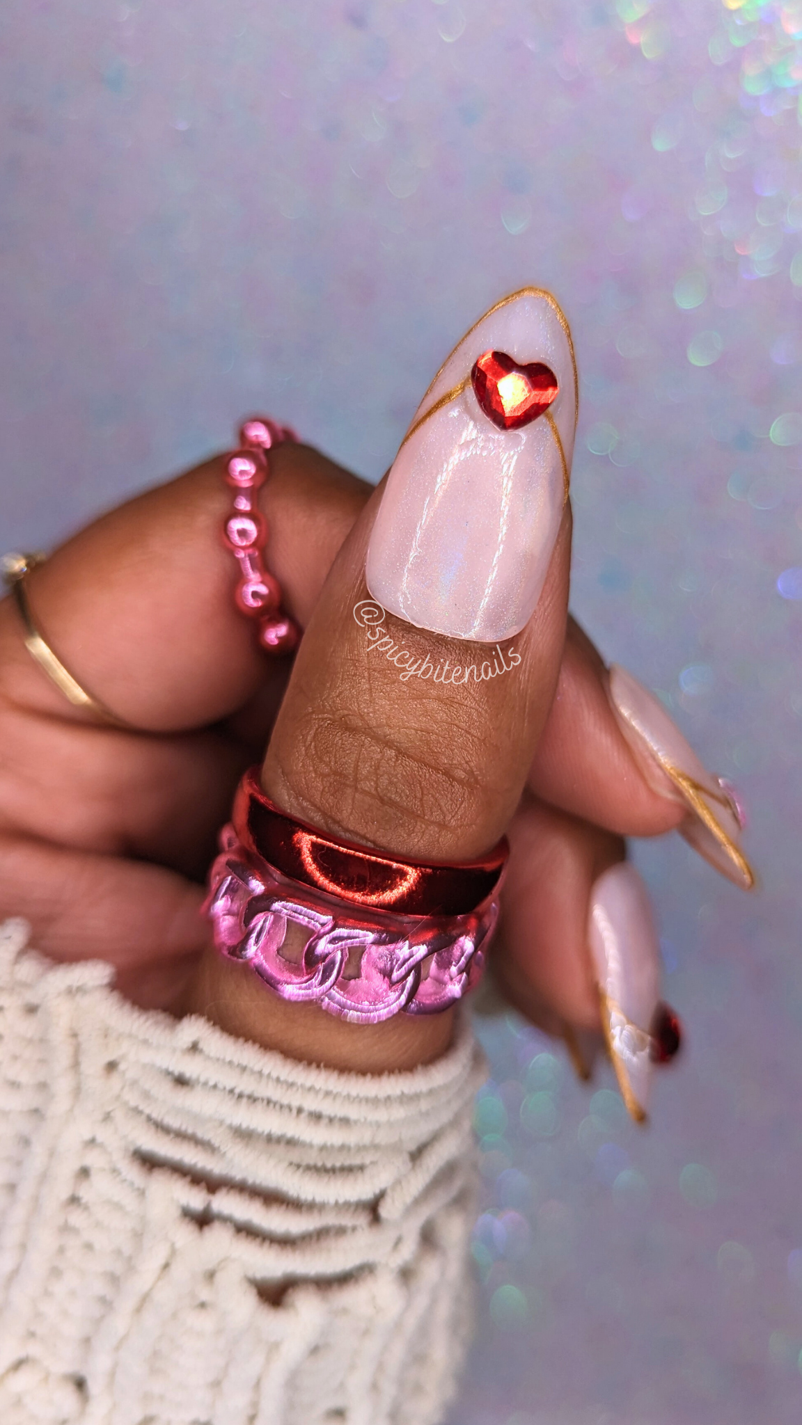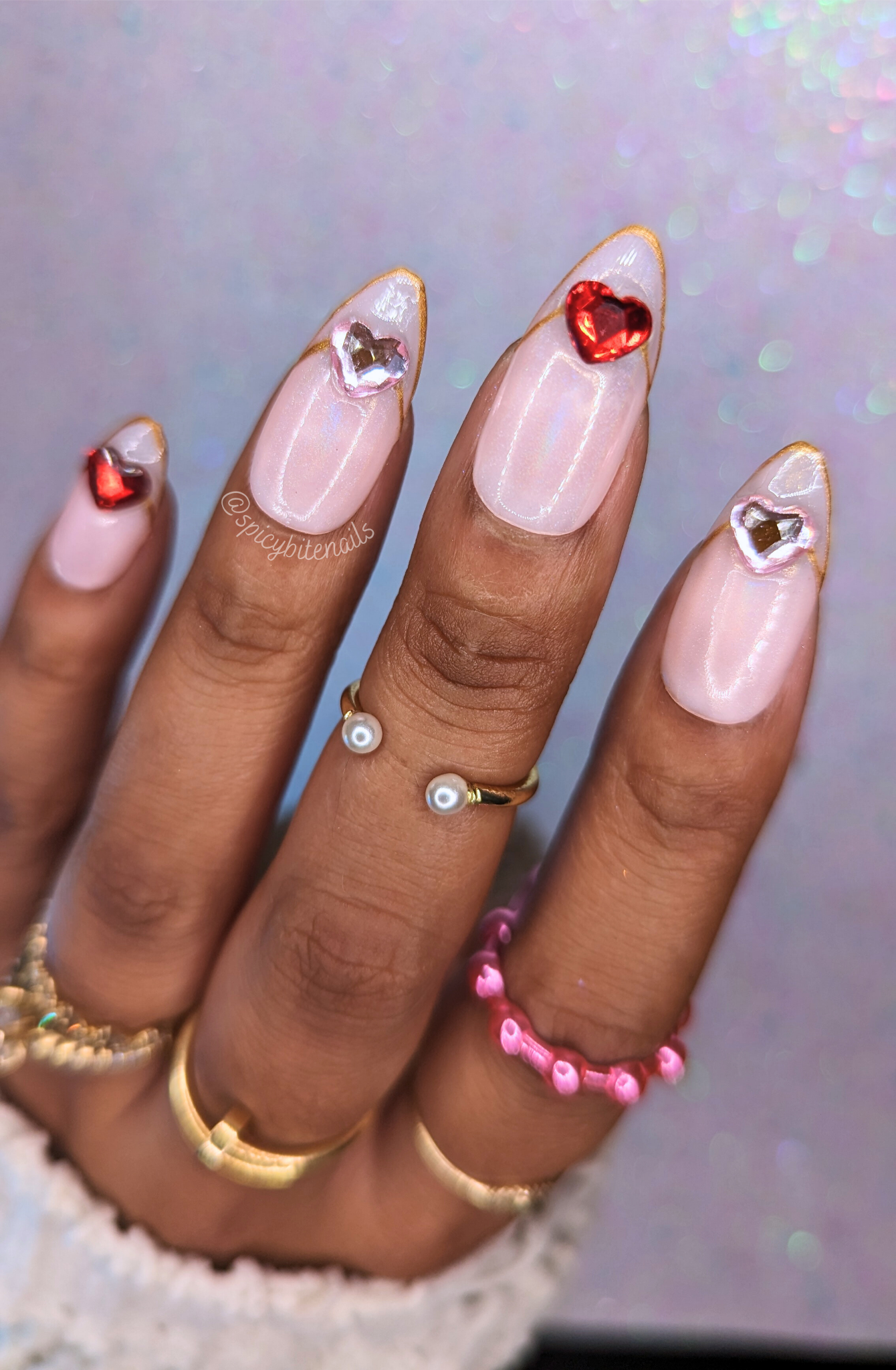 I can’t decide if these are minimalist or not! They are cute though 🙂 Pink and red rhinestone hearts flanked by a delicate gold open french tip and a subtle sheer holographic chrome powder, they’re so sweet!