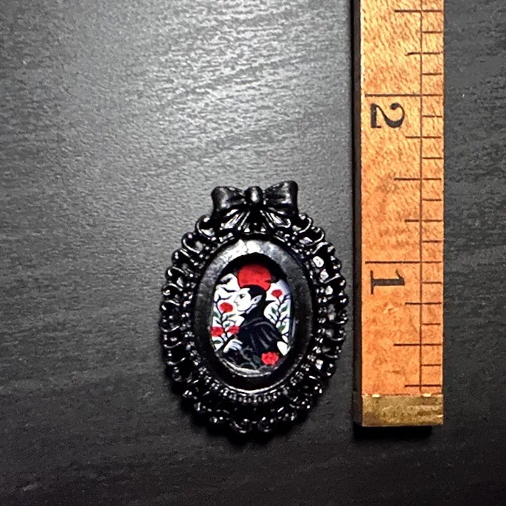 Mini framed magnets with an original painting of a vampire walking through the roses under a full moon. This magnet is 1.5 inches tall and features a black frame and glossy artwork print. The original artwork was done on a wooden canvas using acrylic paint. A unique and fun way to decorate your refrigerator or own a piece of artwork.