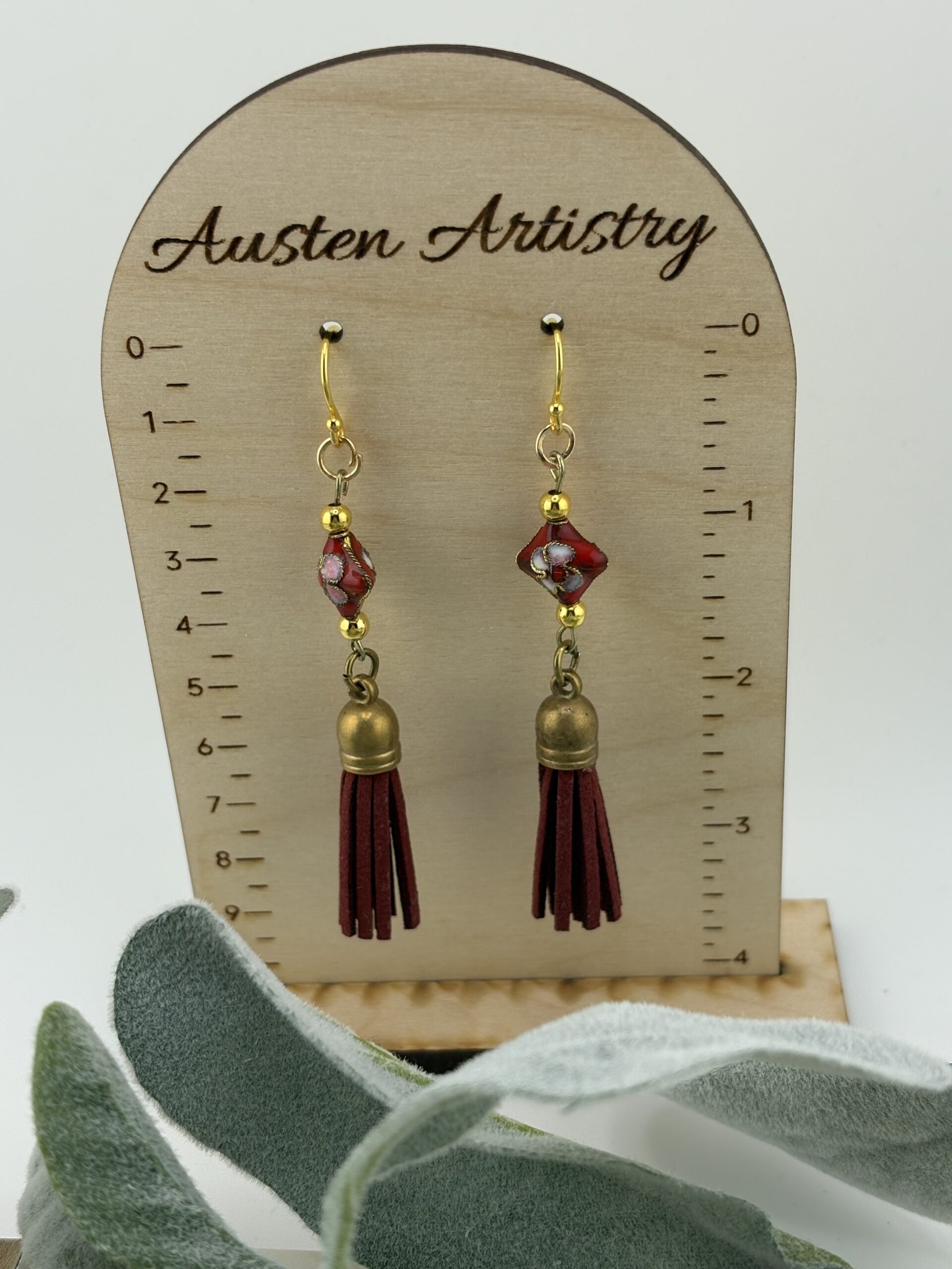 Dress up your outfit any day of the week with these beautiful rouge red Cloisonné & gold tassel earrings.