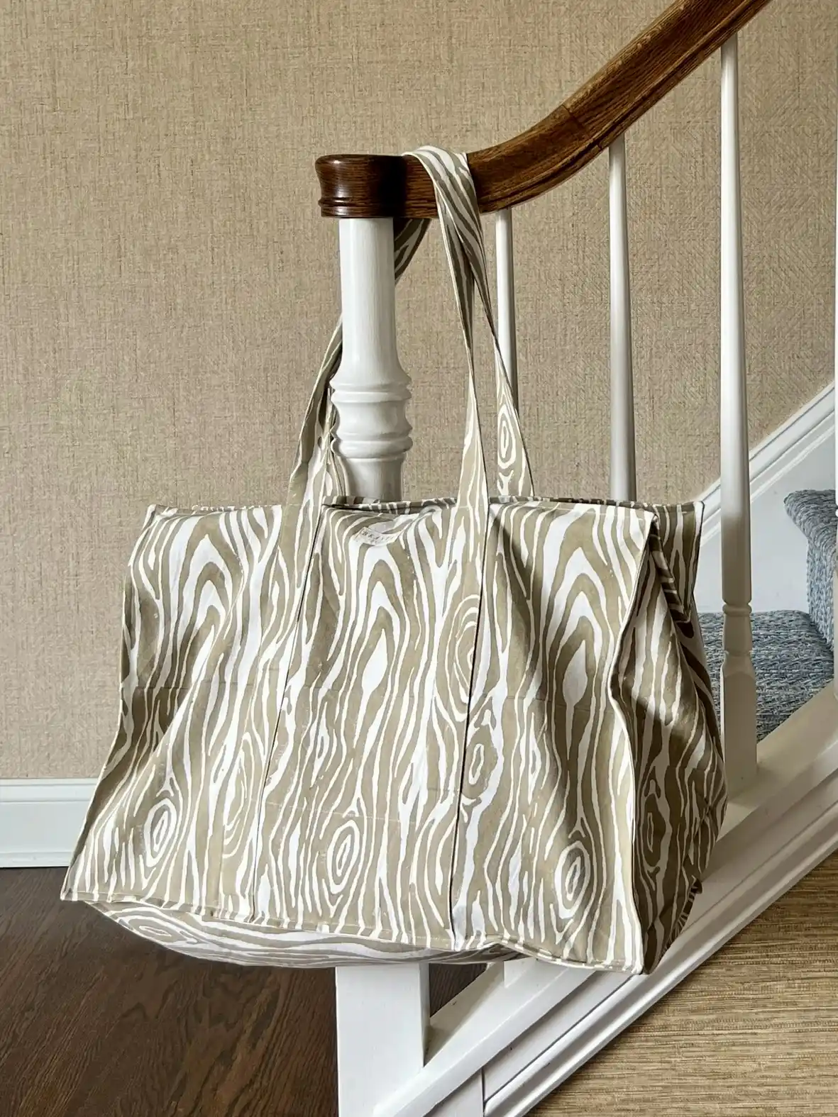 Our Sand Faux Bois Weekender Tote is going to be your new best friend for weekend getaways, shopping trips, afternoons at the beach, etc. The boxy shape expands to include A LOT of stuff and zips closed at the top to ensure that nothing falls out. We have also added two internal pockets so your keys, lipgloss, ear buds, glasses, and other critical items are easily accessible. The organic cotton canvas was hand block printed using nontoxic dyes by a group of amazing artisans in Jaipur, India. We employ ethical, green practices that are kind to workers and the environment.